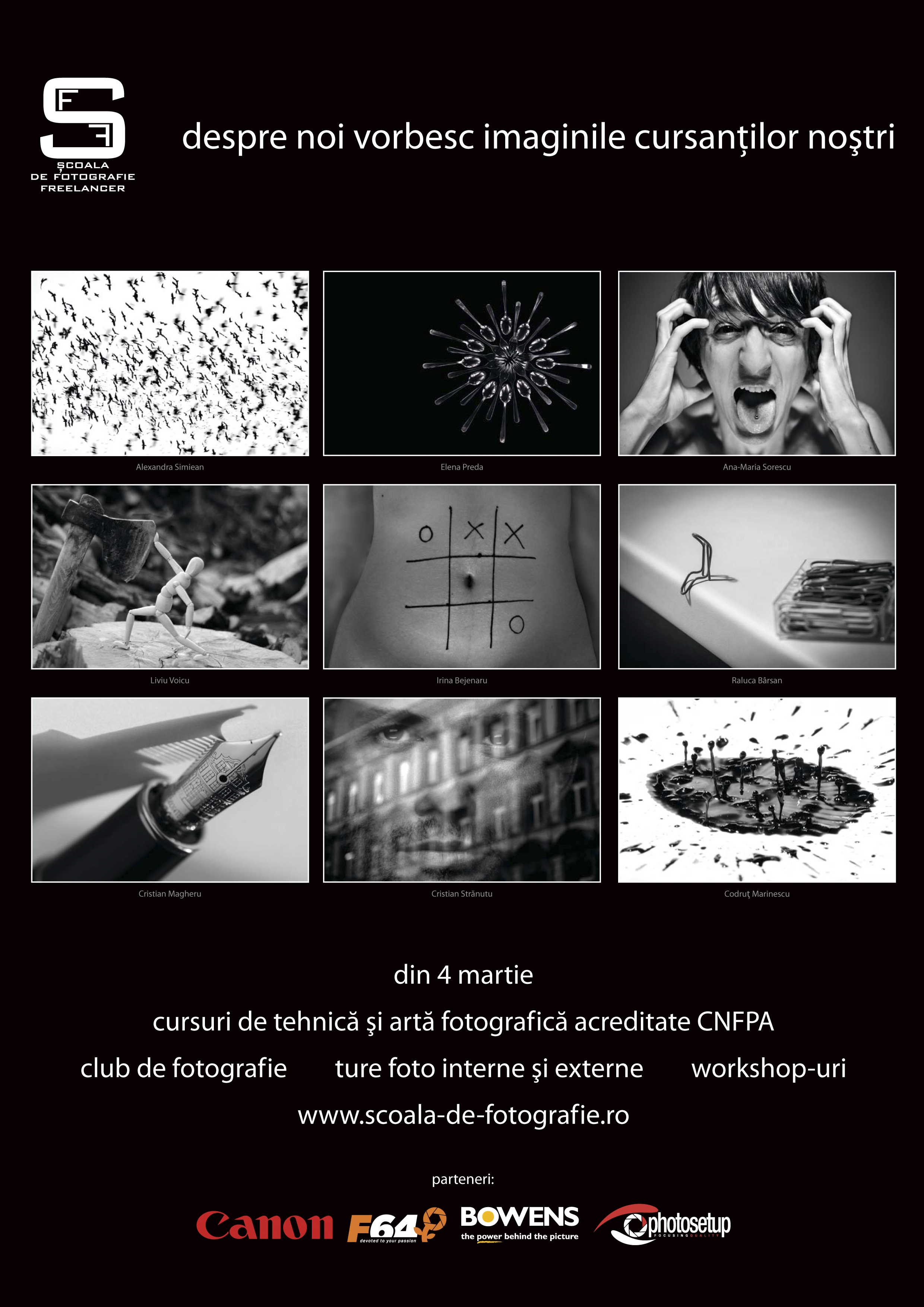 Şcoala de Fotografie Freelancer organizează din 4 martie a şaptea sesiune de cursuri de artă şi tehnică fotografică acreditate CNFPA. SFF pune la dispoziţia cursanţilor pentru sesiunile de practică studio fotografic cu lumină continuă, studio cu flash-uri Bowens, echipamente şi accesorii fotografice. SFF ofera un suport de curs extins, în format pdf, pentru fiecare modul de teorie pe care cursanţii îl primesc în ziua urmatoare cursului. Cursanţii SFF pot recupera cursurile sau sesiunile de practică pierdute într-o sesiune în sesiunea urmatoare de cursuri. SFF organizează Clubul de Fotografie Freelancer unde cursanţii şi absolvenţii se întâlnesc de două ori pe lună cu fotografi consacraţi sau cu personalităţi din domeniile conexe fotografiei. SFF organizează în fiecare sesiune de cursuri workshop-uri de editare fotografică, prelucrare de imagine, flash photography, wedding photography.