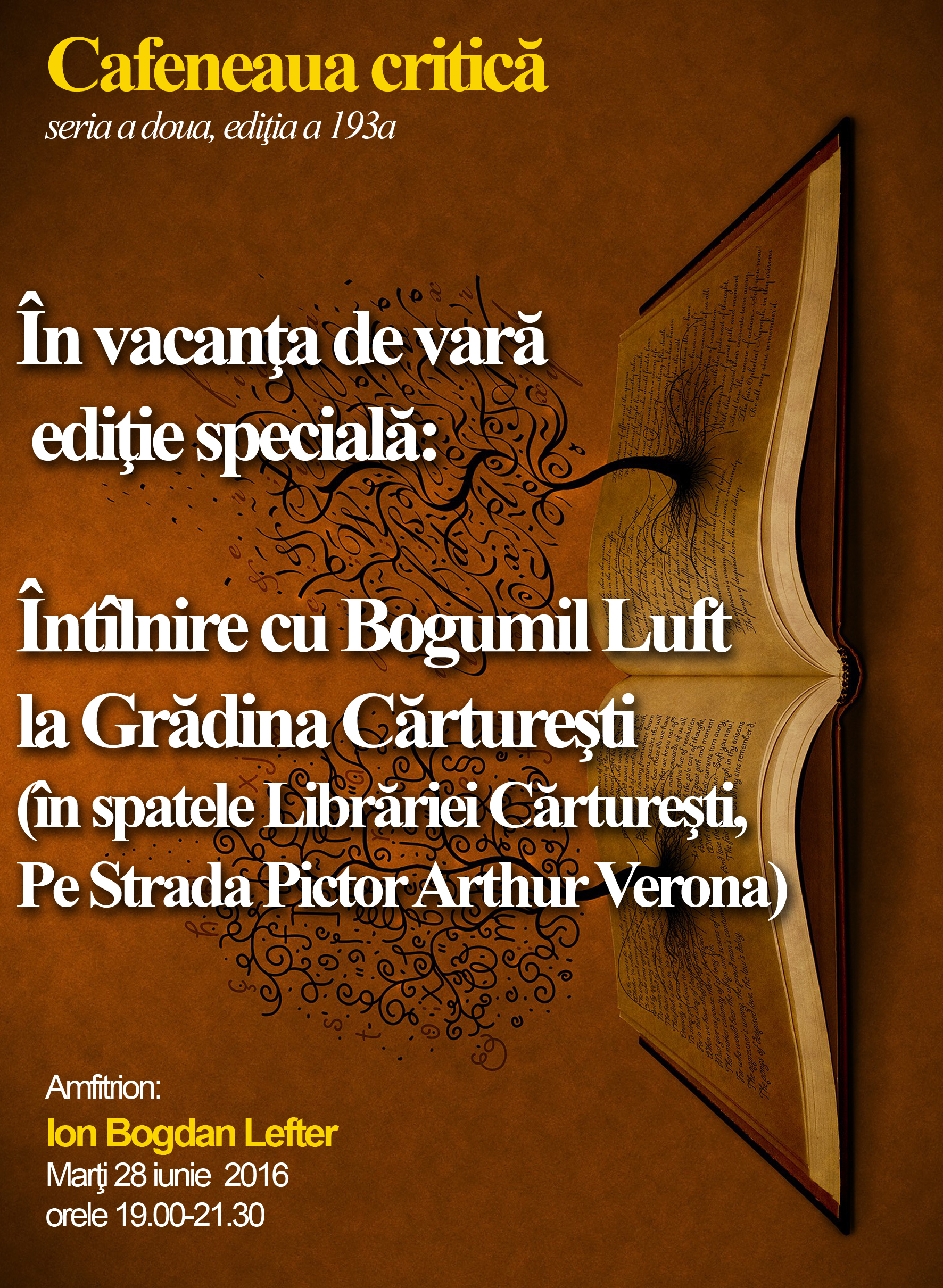 Cafeneaua critică propune o ediţie specială „de vară”/„de vacanţă”: o întîlnire cu jurnalistul şi diplomatul polonez Bogumil Luft şi o dezbatere cu pornire de la cartea sa Românii în goana după happy-end (Editura Polirom, 2015; publicată iniţial în Polonia: Rumun goni za happy endem, 2014) – la Grădina Verona a Librăriei Cărtureşti Verona (pe Strada Pictor Arthur Verona, în spatele librăriei).