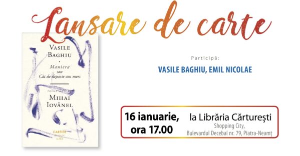 Vineri, 16 ianuarie, la ora 17.00, la Librăria Cărturești din Piatra-Neamț, (Shopping City, Bulevardul Decebal nr. 79), va avea loc lansarea volumului Maniera sau Cât de departe am mers, de Vasile Baghiu, apărut la Editura Cartier (Cartier de colecție nr.63), urmată de o sesiune de autografe.