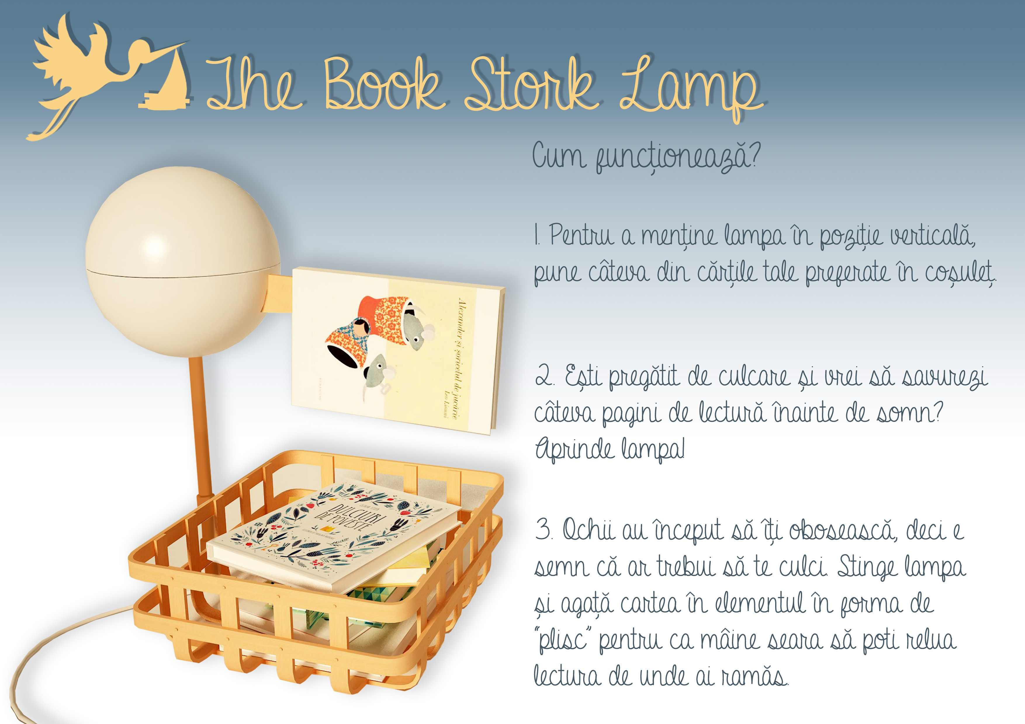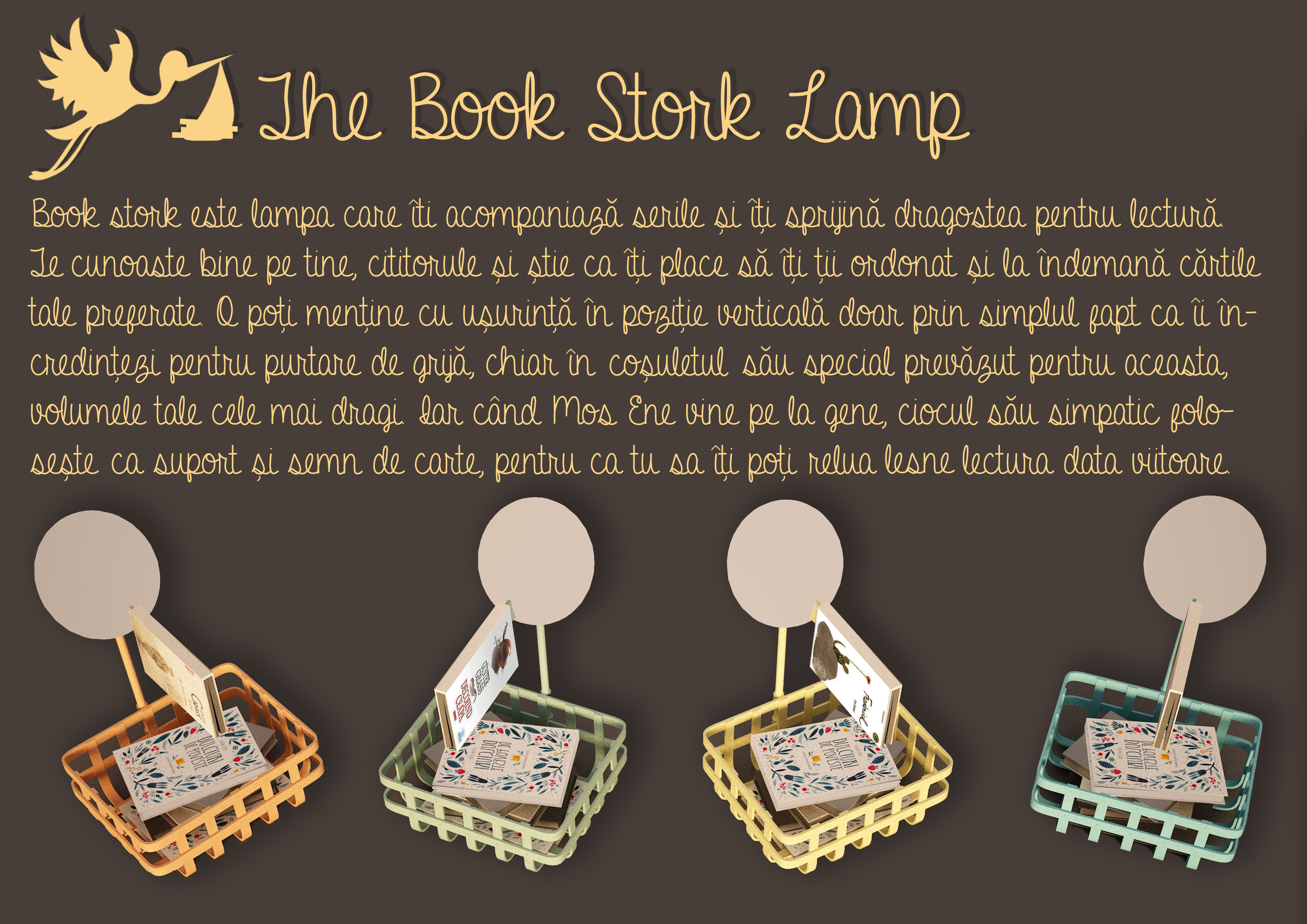 Proiectul Book Stork Lamp semnat de Cristina Bulat ne-a convins prin originalitate, candoare și, în același timp, prin utilitatea lui, reamintindu-ne că pentru un cititor lampa este unul dintre cei mai de seamă tovarăși de călătorie în aventura printre litere, pagini fremătate și personaje schițate la ceas de seară.