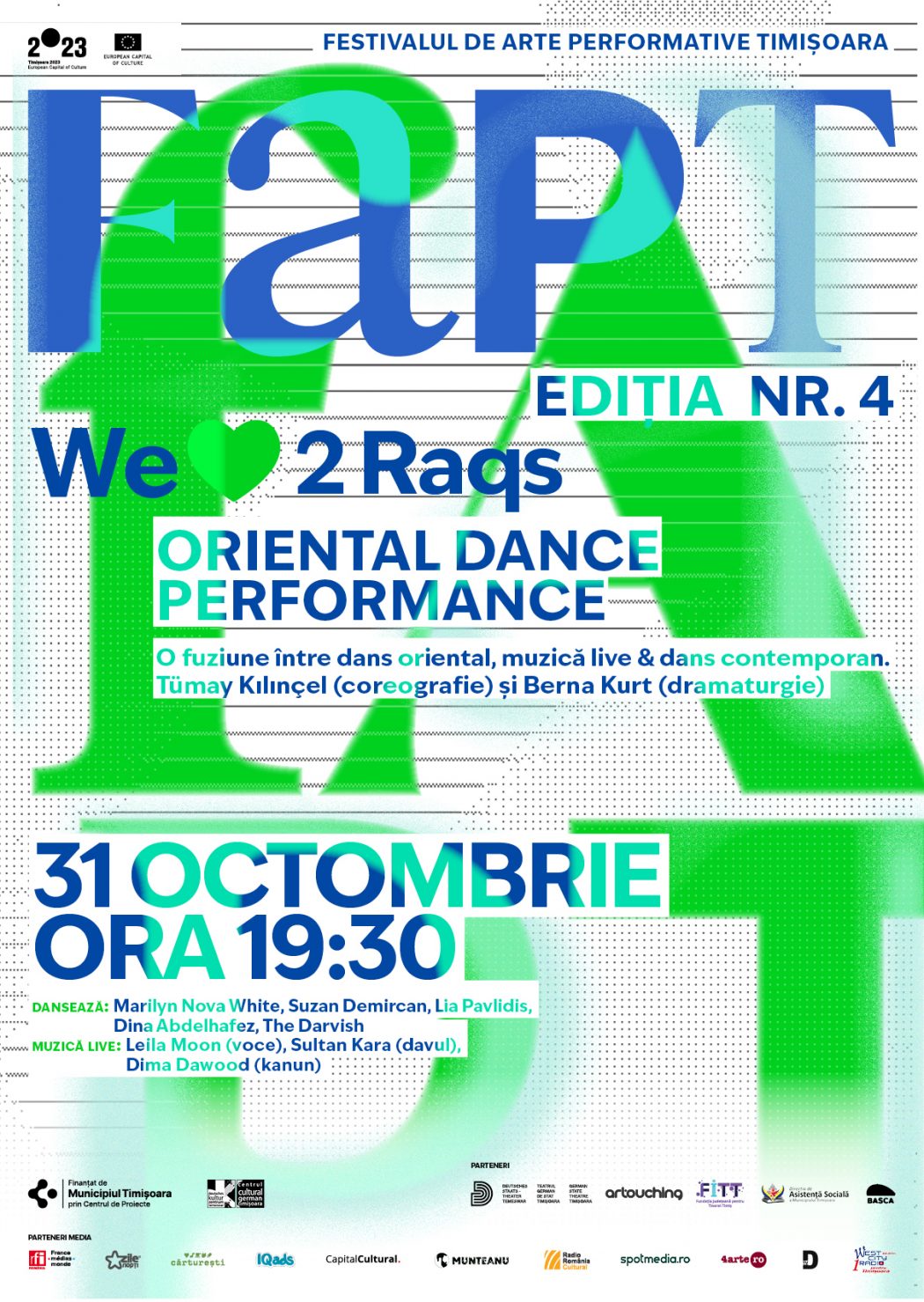 Festivalul de Arte Performative Timișoara (FAPT) te așteaptă la Teatrul German de Stat, marți, 31 octombrie, ora 19:30, să descoperi elementele raqs-ului, într-un spectacol care îmbină dansul oriental, muzica LIVE și dansul contemporan – we ❤2 raqs.