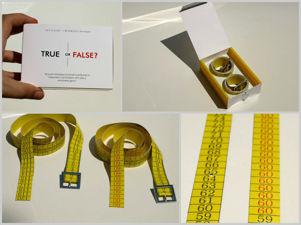 Primul ei proiect de design se numeşte „True or False” şi măsoară, în două curele furate parcă din atelierul de croitorie, talia şi simţul umorului: o curea arată „adevărul”, oprindu-se la numărul real de centimetri, pe când cealaltă e suspendată mereu la standardul de 60. Este un produs provocator care jonglează cu percepţii, clişee şi standarde, care dincolo de aluziile simpatice pe care le face, ridică nişte întrebări în privinţa modului în care ne măsurăm lumea.