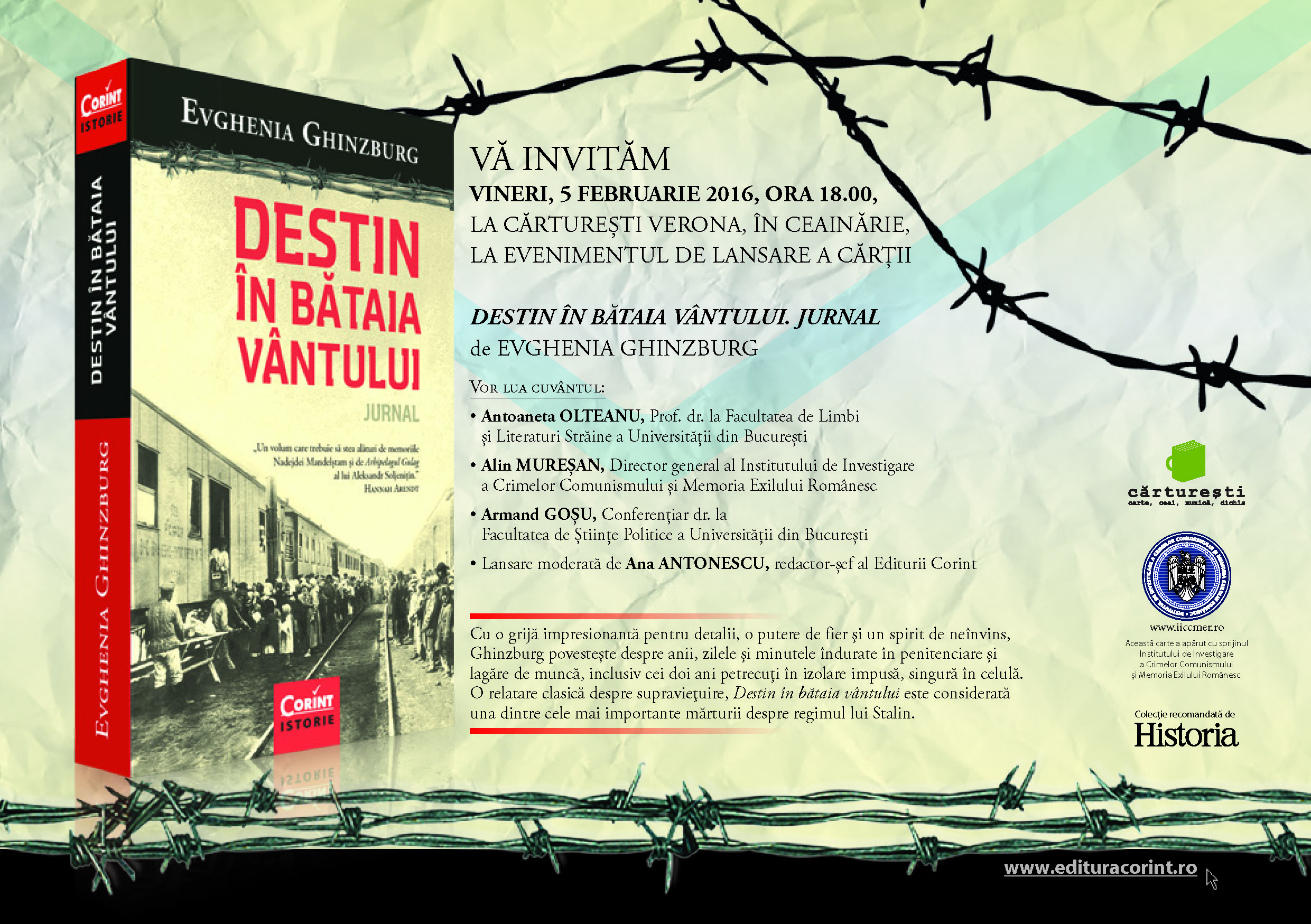 Editura CORINT și Librăria CĂRTUREȘTI VERONA au plăcerea să vă invite VINERI, 5 FEBRUARIE 2016, ORA 18.00, LA CĂRTUREȘTI VERONA, ÎN CEAINĂRIE la lansarea cărții DESTIN ÎN BĂTAIA VÂNTULUI JURNAL de Evghenia Ghinzburg