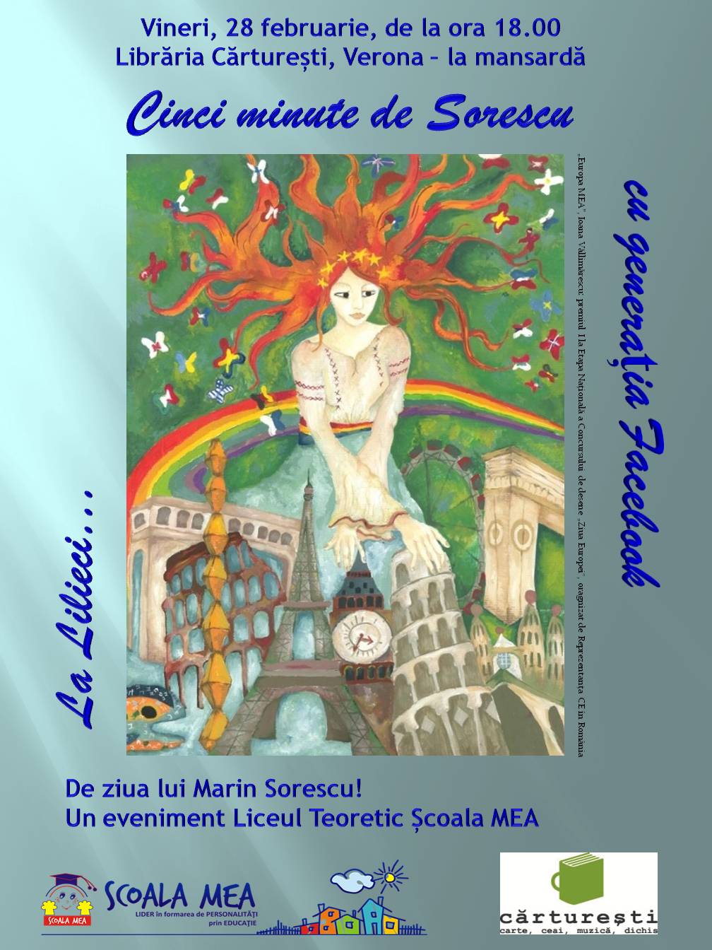 „5 minute de Sorescu” la Cărturești este un recital de poezie in memoriam Marin Sorescu la care vă invită Liceul Teoretic Școala MEA. Vă așteptăm vineri, pe 28 februarie, de la ora 18 la Cărturești Verona – în mansardă – pentru o seară «La Lilieci»: cu generația Facebook!