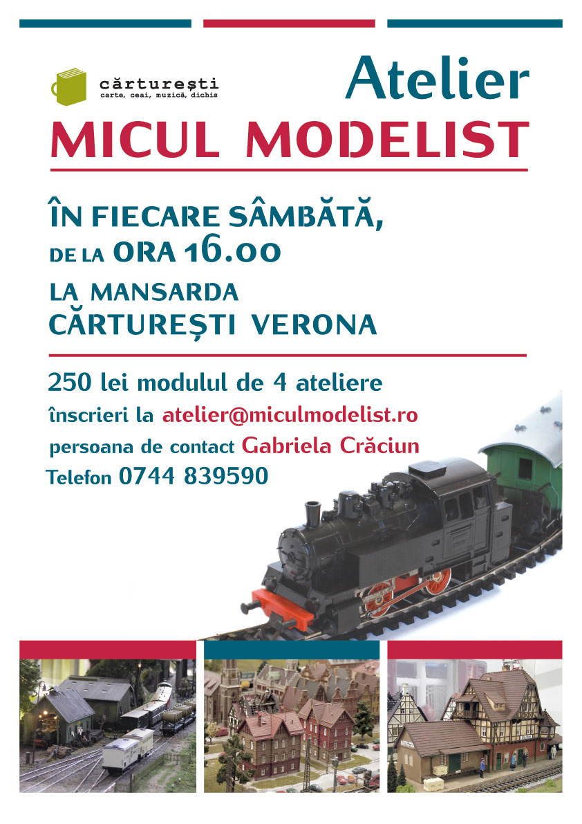 Îi aşteptăm pe copii la atelierul Micul Modelist în fiecare sâmbătă, de la ora 16.00, în Mansarda Cărtureşti Verona, str. Arthur Verona, 13-15. Înscrierile se fac la atelier@miculmodelist.ro, telefon: 0744839590, persoana de contact: Gabriela Crăciun. Costul atelierului este de 250 de lei modulul de 4 întâlniri de 1 ora jumate.