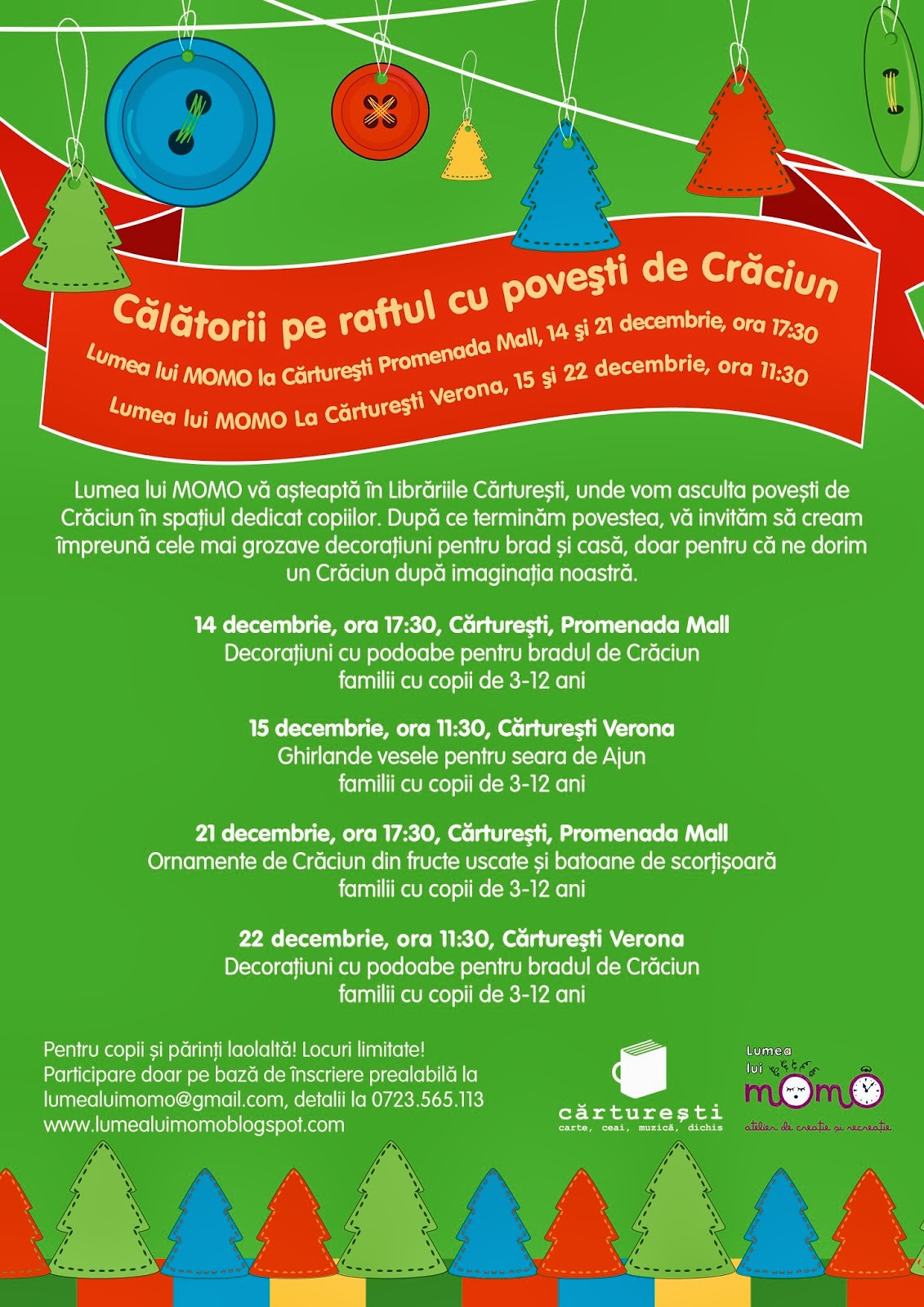 Înscriere: participarea la ateliere, se face doar pe baza de înscriere la lumealuimomo@gmail.com, menționand numele și vârsta copilului și un telefon de contact, în limita locurilor disponibile. Înscrierea devine valabilă, dupa primirea emailului de confirmare. Taxa se achită la locul de desfășurare al atelierului.