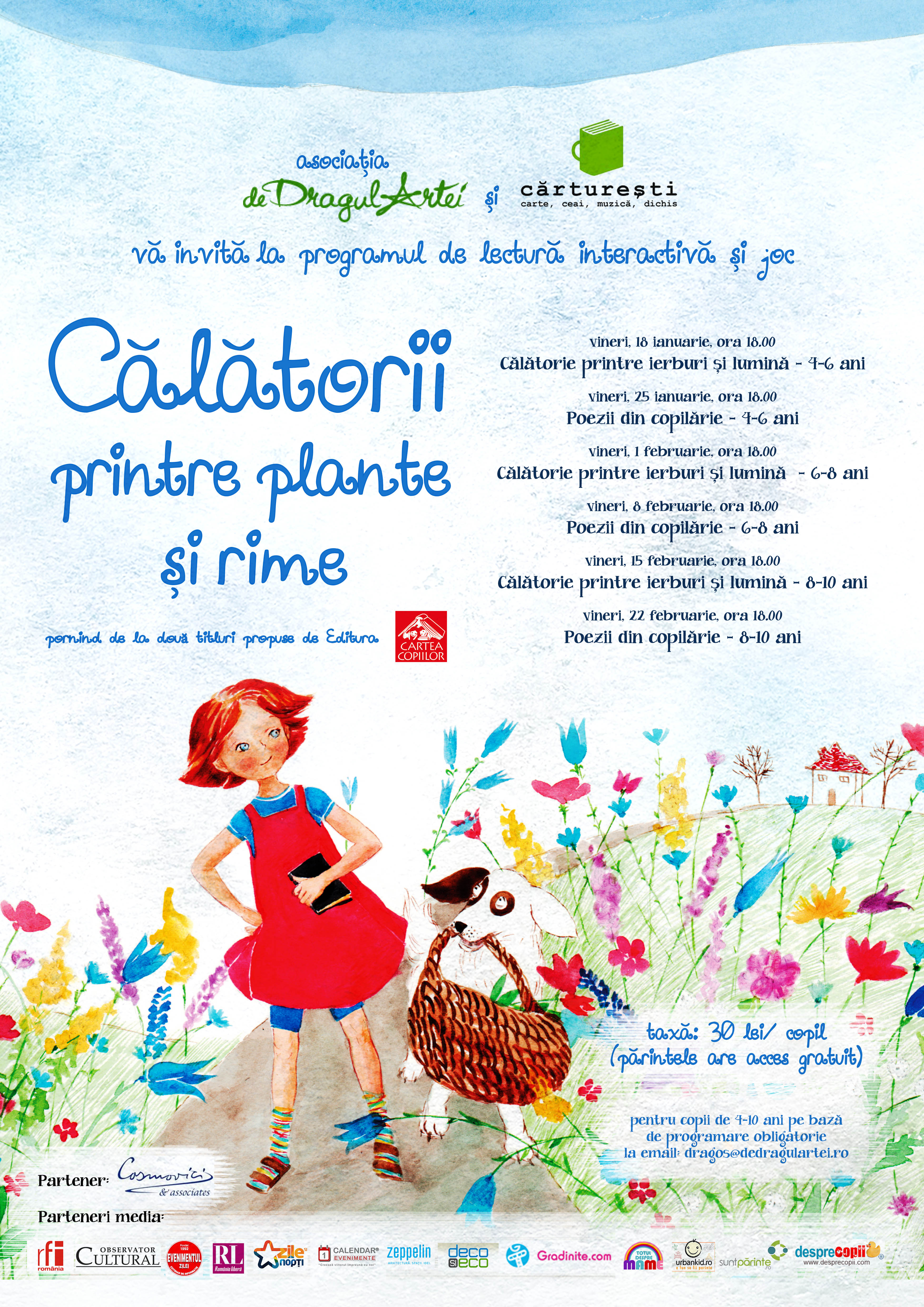 În lunile geroase care au mai rămas, în zilele de vineri, la ora 18.00, Asociația De dragul artei împreună cu Cărturești invită copii de 4-10 ani, la căldurică și la joacă, adică la un program inedit de lectură interactivă și joc: Călătorii printre plante și rime. În mansarda librăriei Cărturești-Verona copiii se vor juca și vor descoperi două cărți atractive ale editurii Cartea Copiilor: Călătorie printre ierburi și lumină și Poezii din copilărie.