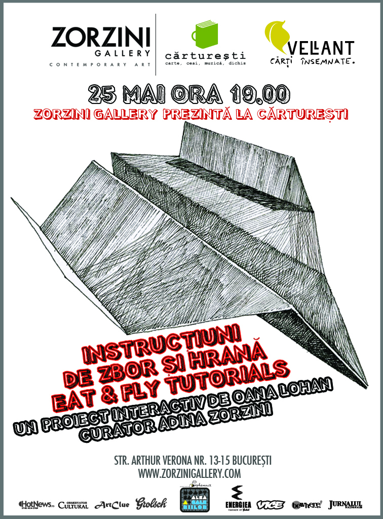 Intalnirea cu artistul va avea loc pe 25 mai in acelasi spatiu mentionat mai sus, incepand cu ora 19:00 iar primele doua fanzine realizate se constituie in activarea Eat & Fly Tutorials si vor avea scopul de a educa publicul, cum sa manance un mar si sa obtina o forma de arhitectura ascunsa sau cum sa construiasca un avion de hartie care…chiar zboara.