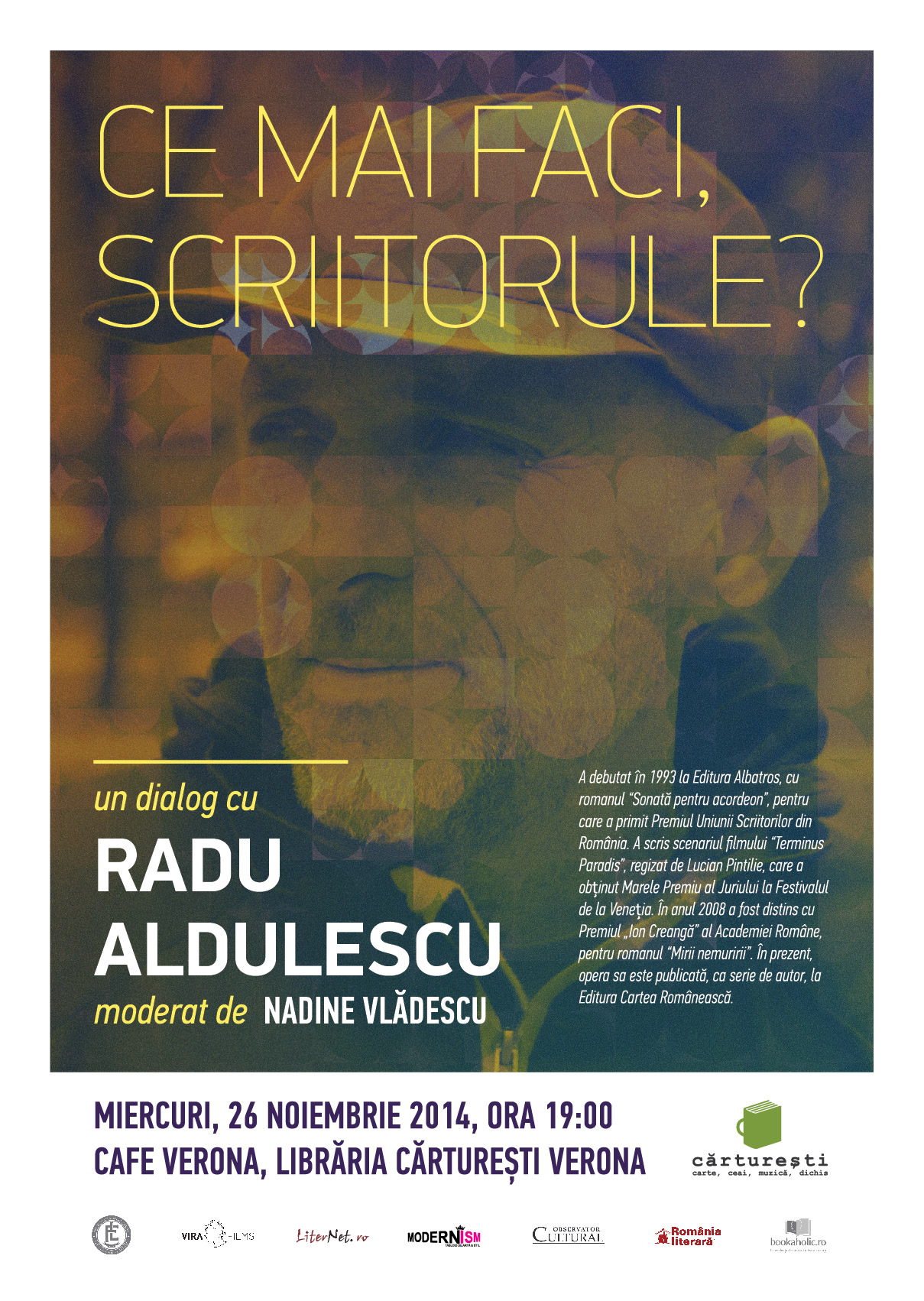 Cum coexistă Bergman, Roth, Murakami și Maria Ciobanu în lumea lui Radu Aldulescu și care este cheia lumilor descrise în romanele sale? Veniți și întrebați-l direct pe scriitor, care va răspunde și întrebărilor noastre și întrebărilor publicului, dintre care cea dintâi rămâne, ca de fiecare dată de-acum încolo, chiar titlul evenimentului nostru: „Ce mai faci, scriitorule?”