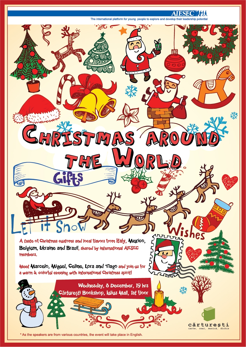 Primiţi cu colinda internaţională? Înainte de sărbători ne bucurăm de prezeţa unor prieteni veniţi de peste mări şi ţări, voluntari AIESEC din Italia, Mexic, Belgia, Ucraina şi Brazilia. Va invităm să intraţi în spiritul Crăciunului în stil international, cu istorisiri despre tradiţiile de Crăciun din cele cinci ţări şi să gustaţi din mâncărurile lor tradiţionale de sărbătoare. Boas Festas sau Srozhdestvom Kristovym, Feliz Navidad sau Crăciun fericit! Evenimentul se va desfăşura în limba engleză.