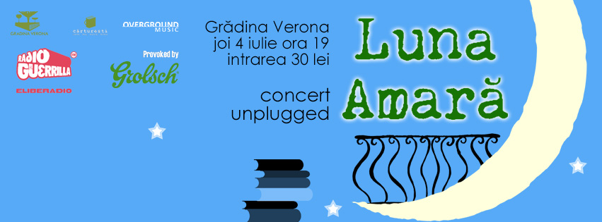 Joi, 4 iulie, de la ora 19:00, seria de concerte acustice de pe timpul verii continuă la Grădina Verona din Bucureşti. De data aceasta vor urca pe scenă cei de la Luna Amară pentru un concert acustic plin de sensibilitate.