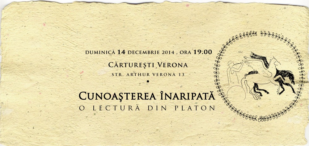 Duminică, 14 decembrie, începând cu ora 19.00, ARCEN – Asociația Română pentru Cultură, Educație și Normalitate, organizează ultimul eveniment din acest an, intitulat „Cunoașterea înaripată. O lectură din Platon”, la Café Verona – Cărturești (strada Arthur Verona, 13-15).