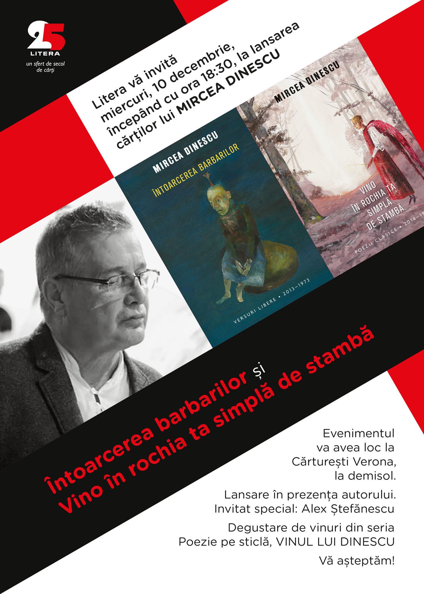 Editura Litera și Cărturești lansează miercuri, 10 decembrie, începând cu ora 18.30, la Cărturești Verona, volumele Întoarcerea barbarilor și Vino în rochia ta simplă de stambă, de Mircea Dinescu. La eveniment participă autorul, alături de Alex Ștefănescu.