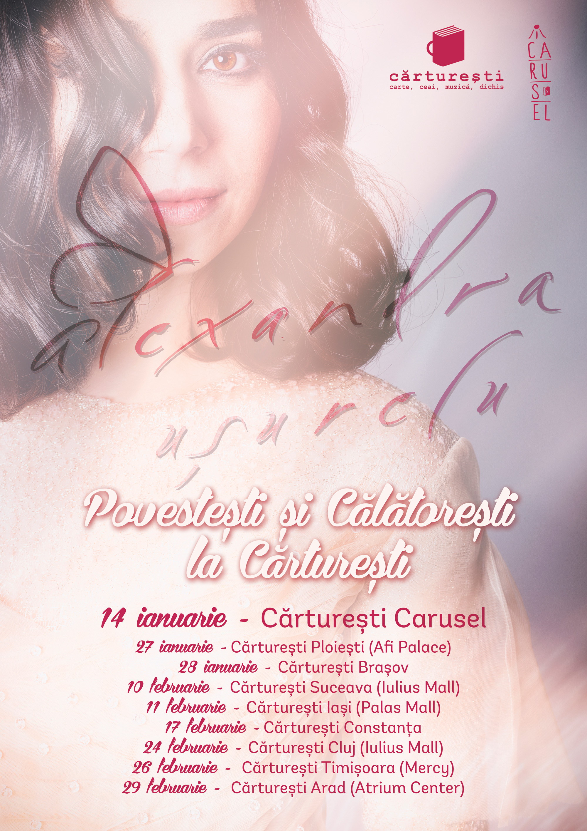 Afis_carturesti-CARUSELÎn mijlocul pregătirilor pentru concertul simfonic #PUR, pe care îl va susține pe 18 ianuarie în Sala Mare a Teatrului Național București, Alexandra își invită publicul joi, 14 ianuarie, ora 19:00, la Cărturești Carusel.