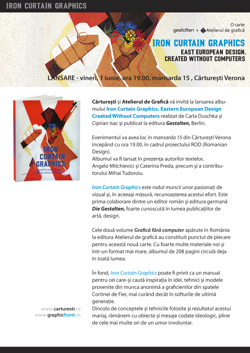 Cărtureşti şi Atelierul de Grafică vă invită la lansarea albumului „Iron Curtain Graphics. Eastern European Design Created Without Computers” realizat de Carla Duschka și Ciprian Isac şi publicat la editura Gestalten, Berlin.