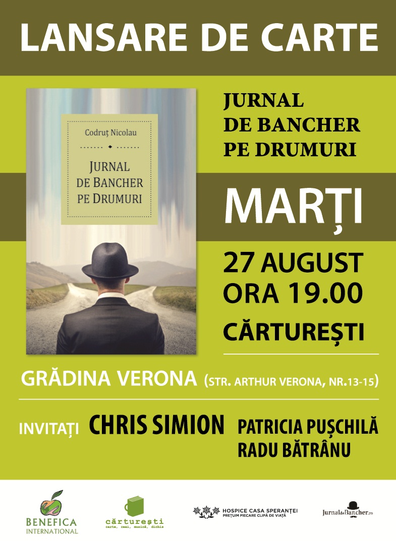 Marți, 27 august, de la ora 19.00, în Grădina Verona, Librăria Cărturești și editura Benefica International vă așteaptă la lansarea cărții Jurnal de bancher pe drumuri, de Codruț Nicolau. Alături de autor, vor lua cuvântul în Grădina Verona (Cărturești, str. Arthur Verona, nr.13-15): Chris Simion, Patricia Pușchilă și Radu Bătrânu.