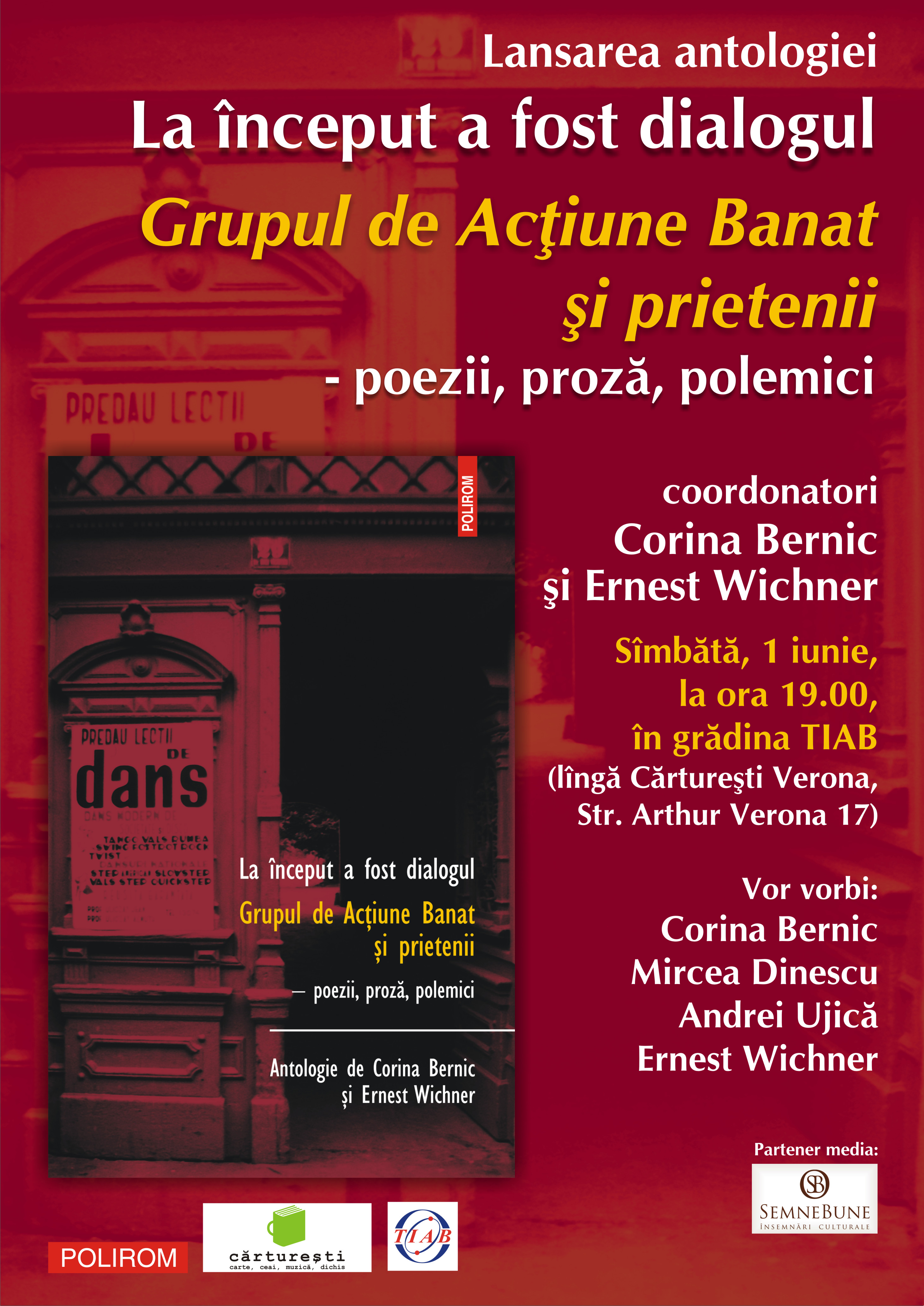 Afis Grupul de actiune BanatSimbata, 1 iunie, de la ora 19.00, in gradina TIAB (linga Carturești Verona, Str. Arthur Verona 17) din Bucuresti, va avea loc lansarea antologiei La inceput a fost dialogul. Grupul de Actiune Banat si prietenii. Poezii, proza, polemici, volum coordonat de Corina Bernic si Ernest Wichner si aparut in aceasta saptamana la Editura Polirom.