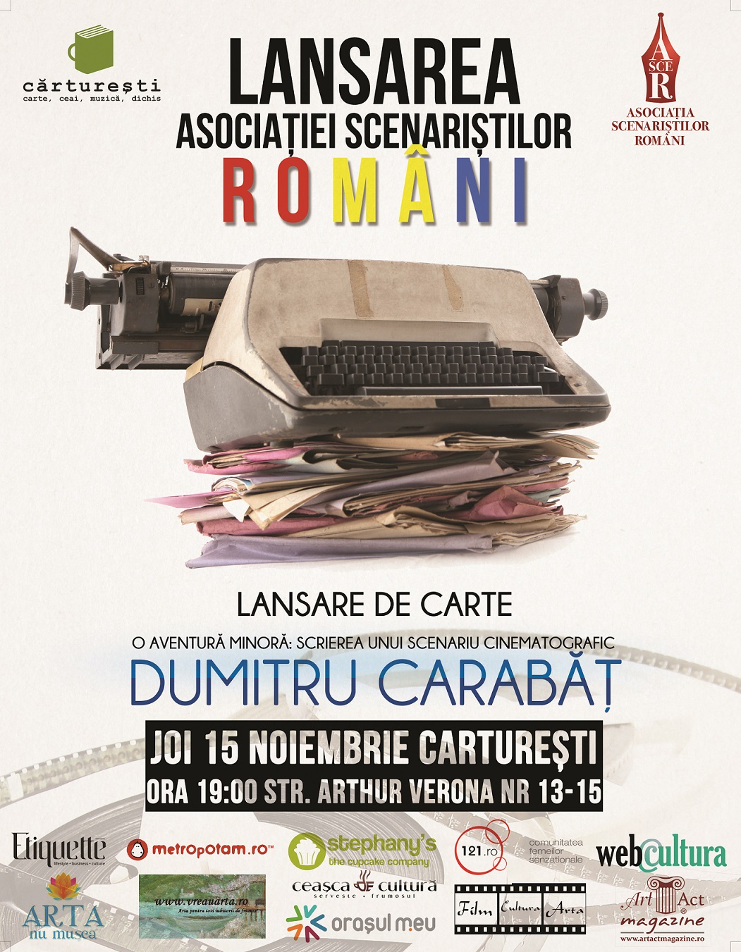 Asociaţia Asociaţia Scenariştilor români vă invită joi, 15 noiembrie 2012, începând cu ora 19:00, la manifestaţia cultural-artistică ”Lansarea Asociaţiei Scenariştilor români” ce se va desfăşura la Librăria Cărtureşti. (Magheru, str. Arthur Verona, nr 13-15).