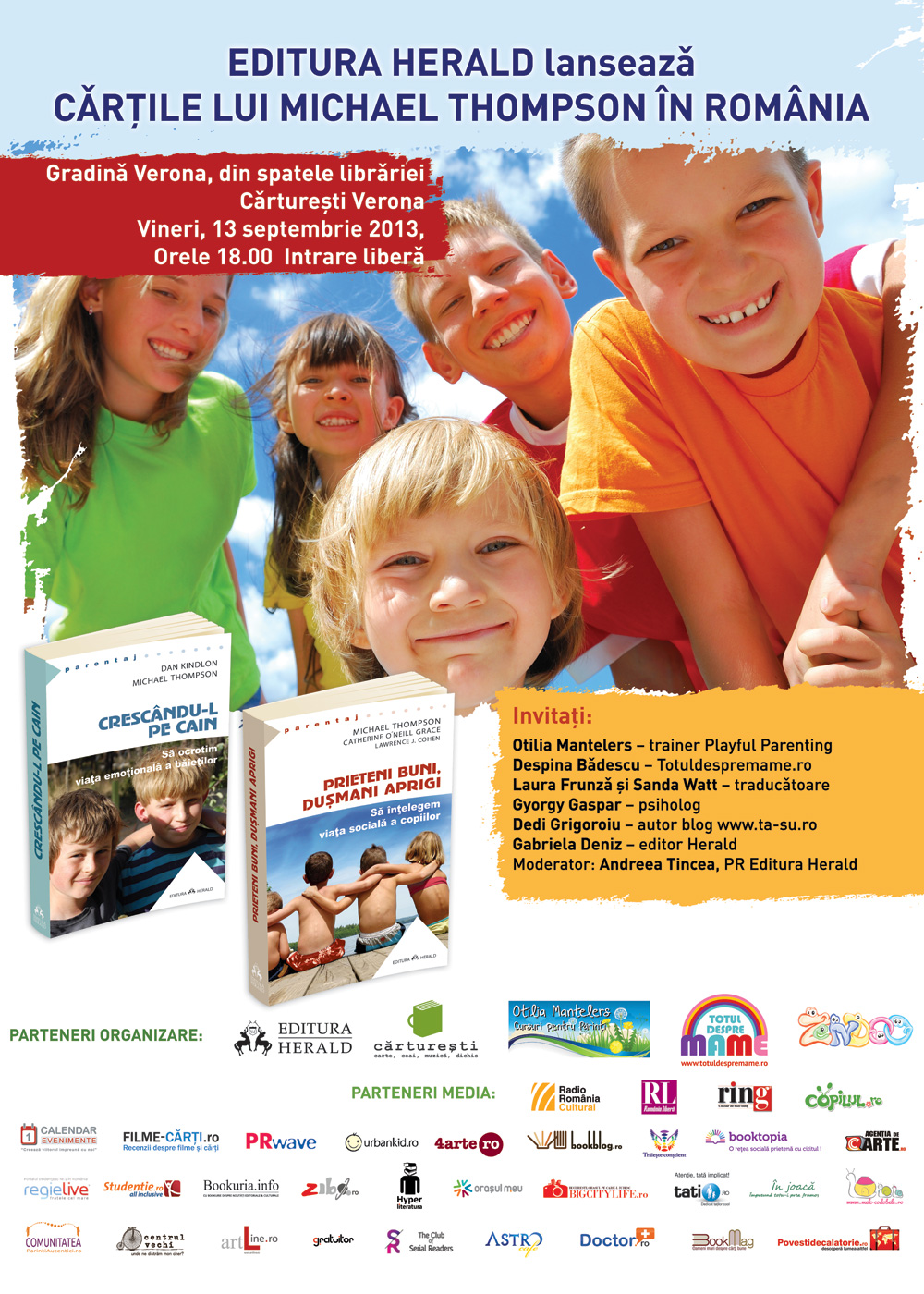 Editura HERALD alături de partenerii săi, Otilia Mantelers şi TOTUL DESPRE MAME, vă invită vineri, 13 septembrie 2013, orele 18.00, în Grădina Verona, la evenimentul de lansare a două dintre cărţile psihoterapeutului Michael Thompson: