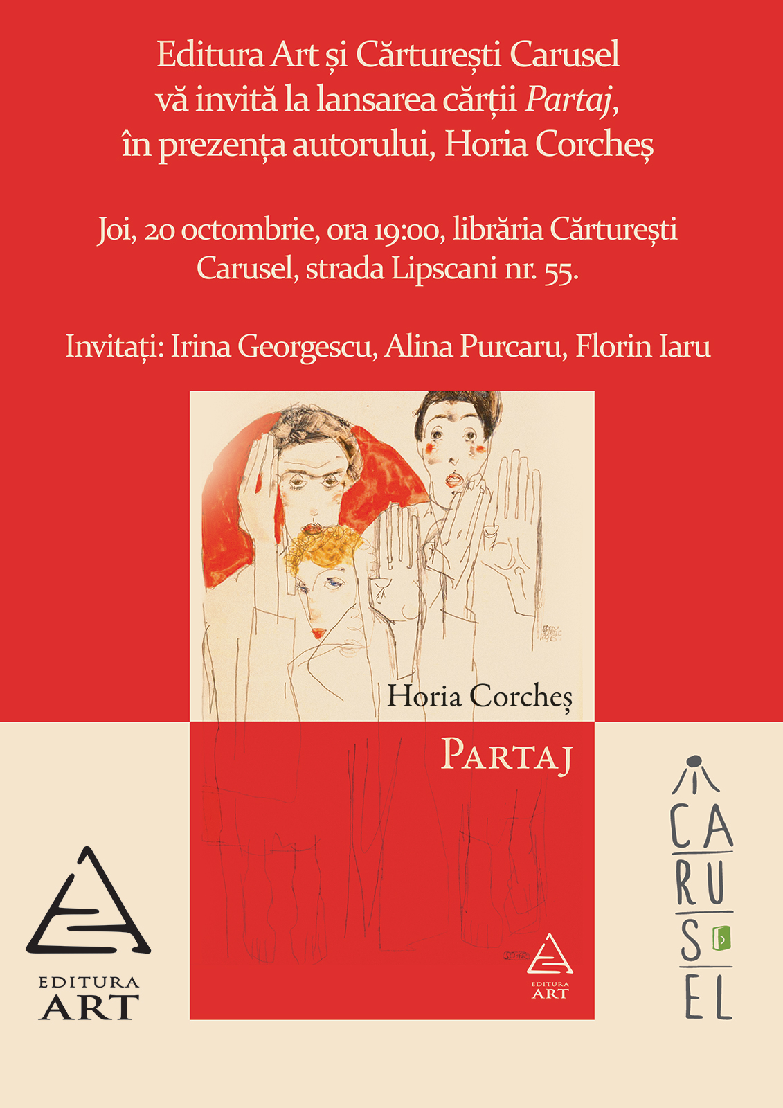 Editura ART și Cărturești Carusel vă invită joi, 20 octombrie, începând cu ora 19:00, la lansarea romanului “Partaj“, în prezența autorului, Horia Corcheș. Invitați: Irina Georgescu, Alina Purcaru și Florin Iaru. Pe Lipscani 55, la Carusel.
