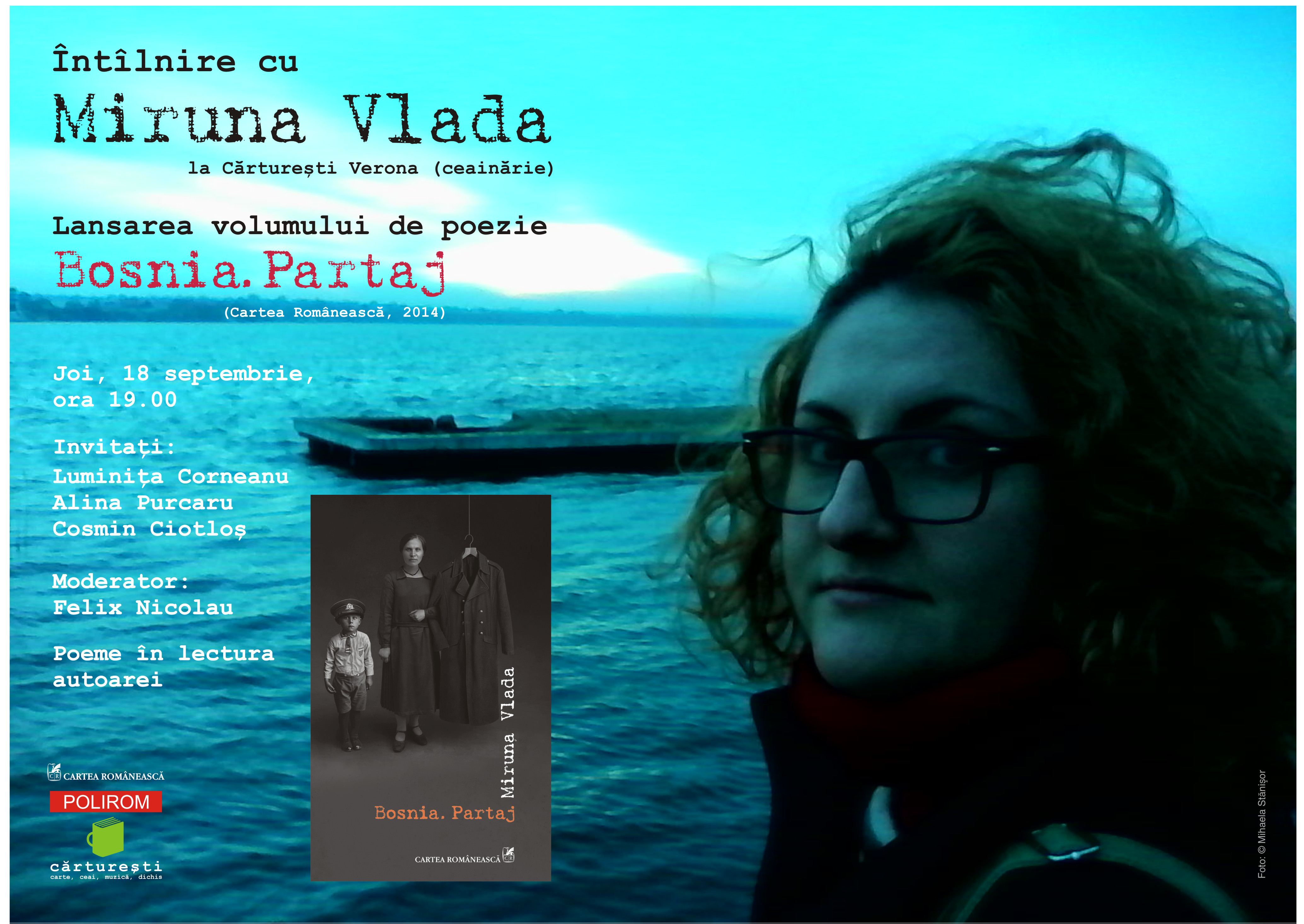 Joi, 18 septembrie, la ora 19.00, la Librăria Cărtureşti Verona (ceainărie), va avea loc o întîlnire cu Miruna Vlada, cu prilejul lansării noului său volum de poezie, Bosnia. Partaj, apărut de curînd la Cartea Românească, şi în ediţie digitală.