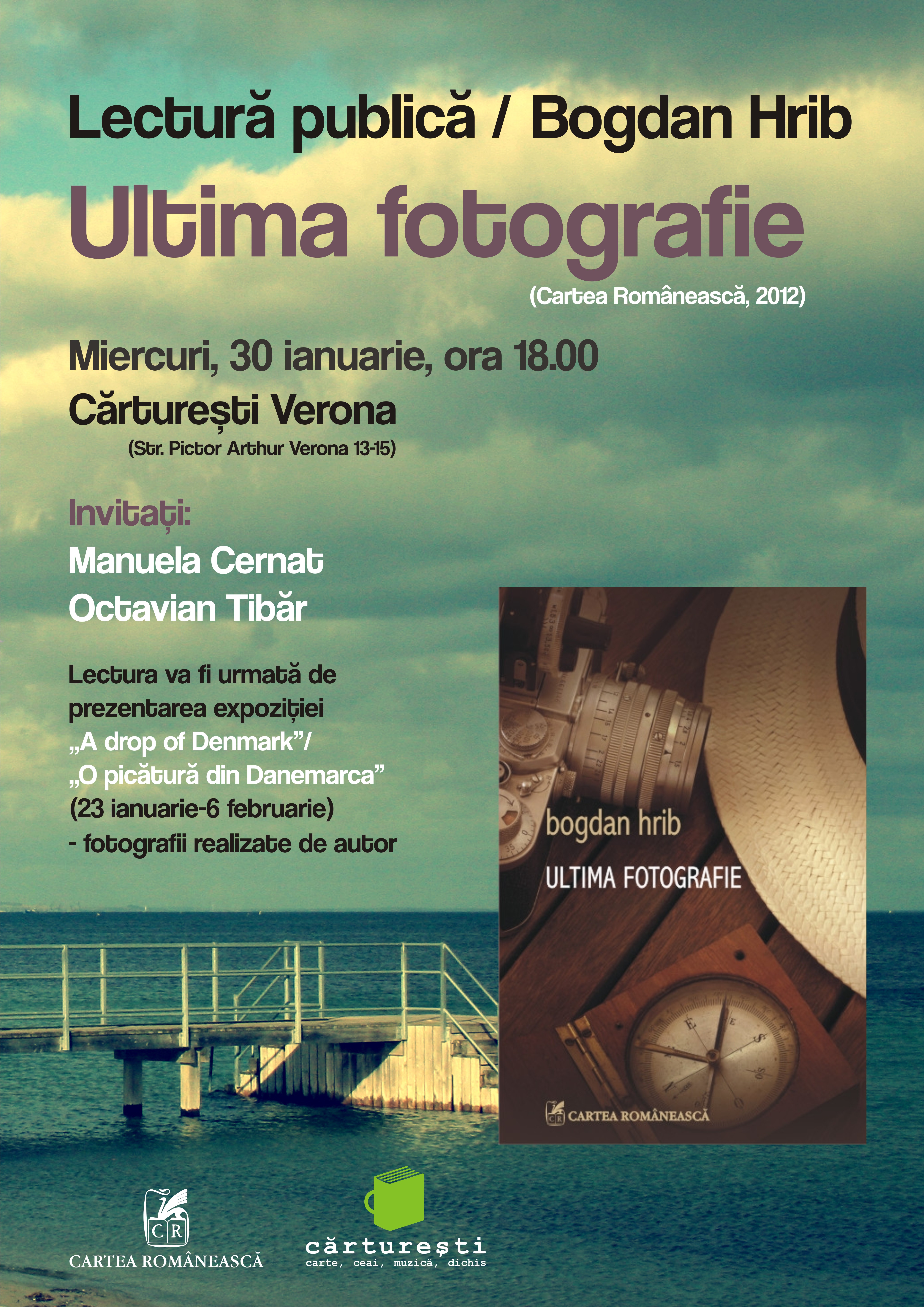 Ultima fotografieMiercuri, 30 ianuarie, de la ora 18.00, la Cărtureşti Verona (Str. Pictor Arthur Verona 13-15) din Bucureşti, Bogdan Hrib va citi din cel mai recent roman al său, Ultima fotografie, apărut la Editura Cartea Românească.Invitaţi: Manuela Cernat, Octavian Tibăr