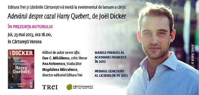 Tânărul autor elveţian, Joël Dicker, îşi lansează la Bucureşti romanul Adevărul despre cazul Harry Quebert, recompensat cu Marele Premiu al Academiei Franceze în 2012 şi publicat de Editura Trei.