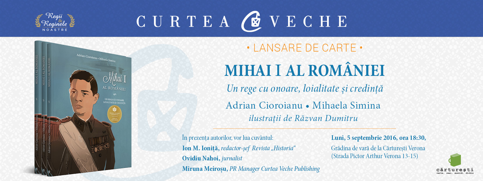 Lansarea va avea loc luni, 5 septembrie 2016, în Grădina de vară de la Cărturești Verona (Strada Pictor Arthur Verona 13-15, București, în spatele librăriei Cărturești), începând cu ora 18.30. Vă invităm alături de autorii volumului, Adrian Cioroianu și Mihaela Simina, să ascultați povești interesante și captivante despre destinul Regelui Mihai I, toate spuse pe înțelesul celor mici. Alături de autori, vor lua cuvântul Miruna Meiroșu, PR Manager Curtea Veche Publishing, Ion M. Ioniță, redactor-șef al Revistei Historia și Ovidiu Nahoi, jurnalist.