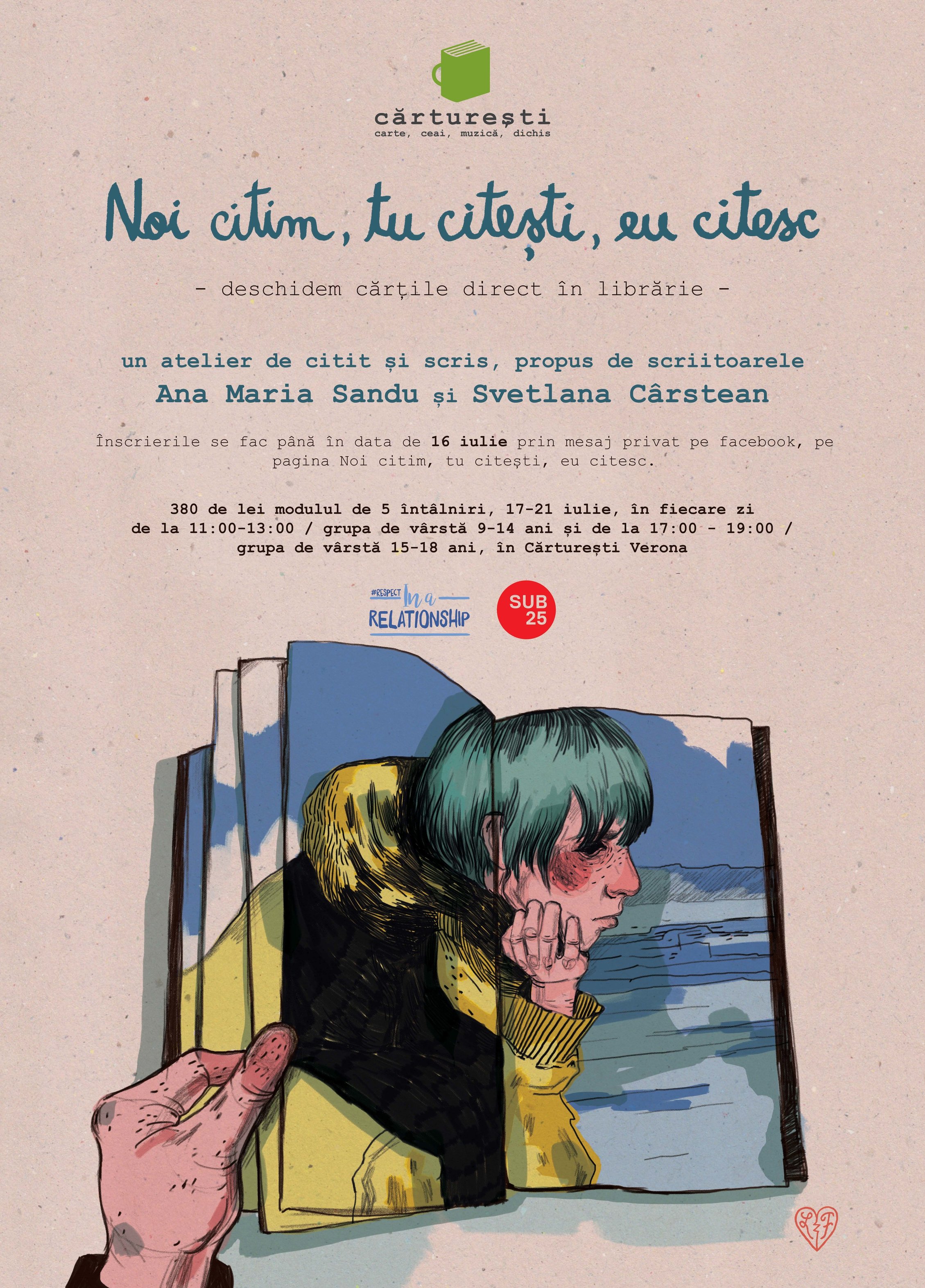 rsz_1rsz_50x70“Noi citim, tu citești, eu citesc” e un atelier de citit și scris, propus de scriitoarele Ana Maria Sandu și Svetlana Cârstean. Pentru că literatura e despre fiecare dintre noi. Pentru că ne-am plictisit să tot auzim fraza asta: „Copiii și tinerii din ziua de azi nu citesc”. Pentru că există o carte sau mai multe care să ni se potrivească fiecăruia dintre noi. Pentru că citind literatură, citim lumea în care trăim și ne putem povesti pe noi înșine celorlalți. Ana Maria Sandu și Svetlana Cârstean vă așteaptă la atelierul de citit și scris, în mansarda librăriei Cărturești Verona în perioada 17-21 iulie. Între orele 11 și 13, pentru grupa de vîrstă 10-14 ani, între 17 și 19, pentru cei cu vîrste între 15-18 ani. Prețul unui curs este de 380 RON. Înscrierile se fac pînă în data de 16 iulie prin mesaj privat pe facebook, pe pagina Noi citim, tu citești, eu citesc