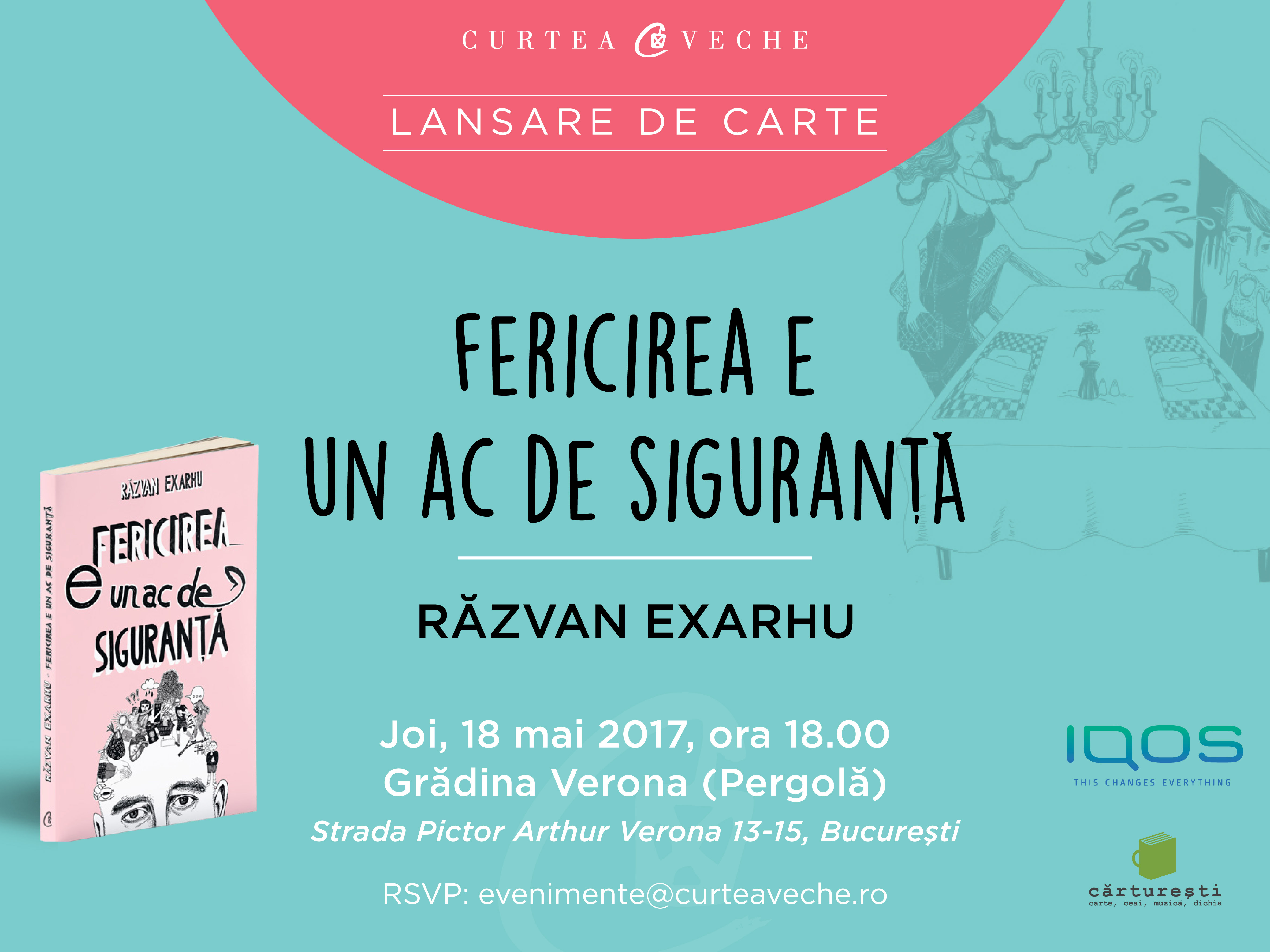 Curtea Veche Publishing și Librăria Cărturești Verona vă invită joi, 18 mai 2017, la o întâlnire cu autorul, povestitorul, ironicul, curiosul, carismaticul Răzvan Exarhu, cu ocazia lansării primei sale cărți, “Fericirea e un ac de siguranță”, cu ilustrații de Andreea Chirică. O carte care vă va face să râdeți cu lacrimi, dar și să plângeți la câteva rânduri distanță.