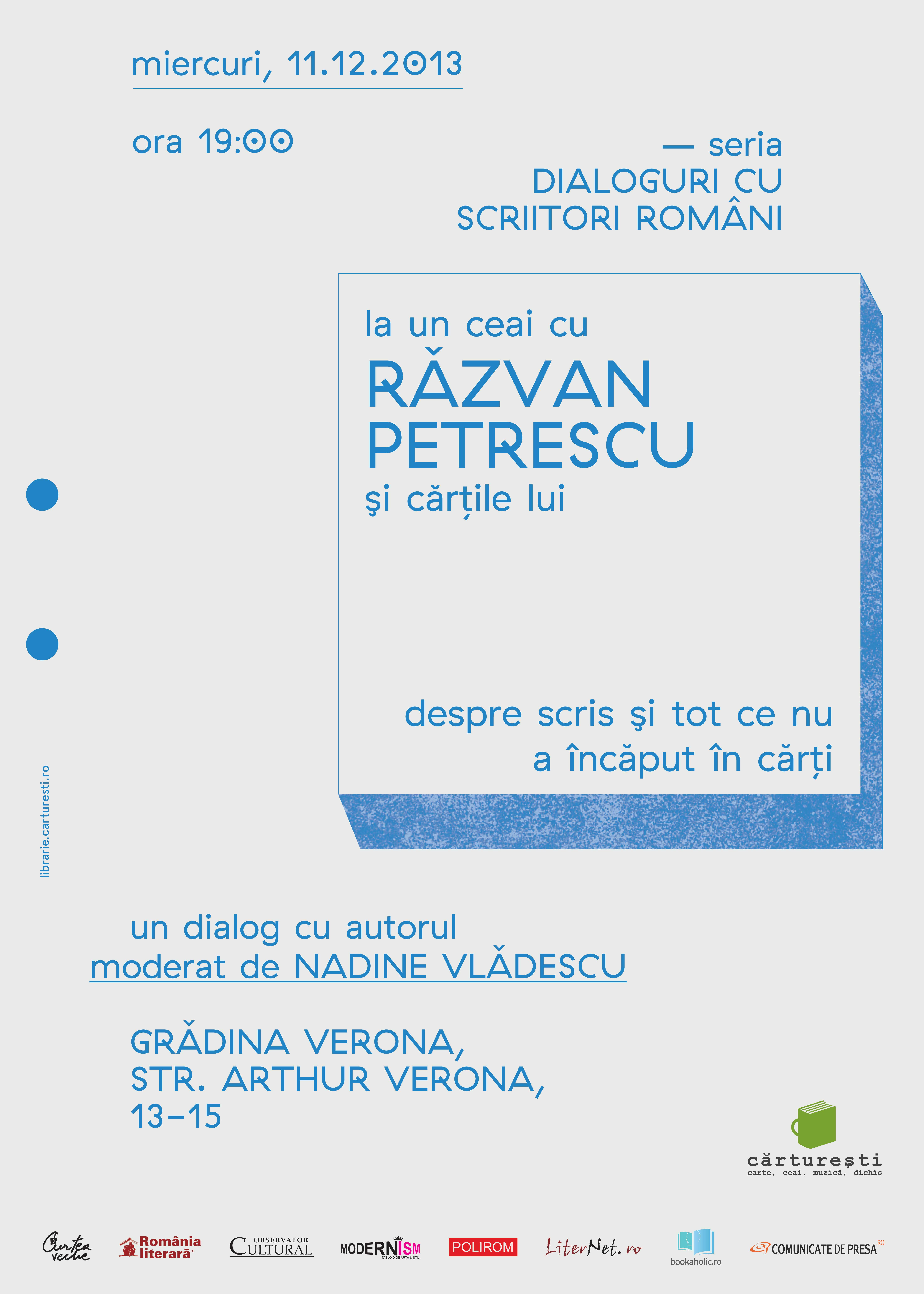 Așadar, o întâlnire de neratat: miercuri, 11 decembrie, de la ora 19, numai la Dialoguri cu scriitori români, în cafeneaua Cărturești Verona, într-un dialog cu Nadine Vlădescu. De data aceasta, misiunea moderatoarei va fi aceea de a reuși să nu zâmbească extatic de la începutul până la sfârșitul convorbirii. Asta sau să nu se îndrăgostească lulea de invitat. Așadar, dați buzna sau căiți-vă pentru totdeauna.
