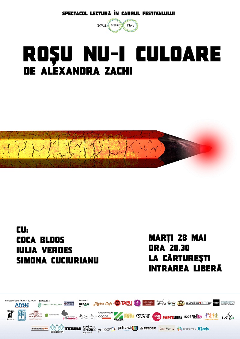Cea de-a treia săptămână a Festivalului Scrie despre Tine continuă şi cu alte piese de teatru în reprezenţatii lectură şi cu premiera unei noi piese montată în spectacol. În seara aceasta, de la 20:30, la Cărtureşti Verona, se citeşte piesa Roşu nu-i culoare de Alexandra Zachi. Coca Bloos, Iulia Verdes şi Simona Cuciarianu vor citi acest text ce tratează relaţia devoratoare maestru-elev într-un text profund scris de o tânără dramaturgă de doar 26 de ani.