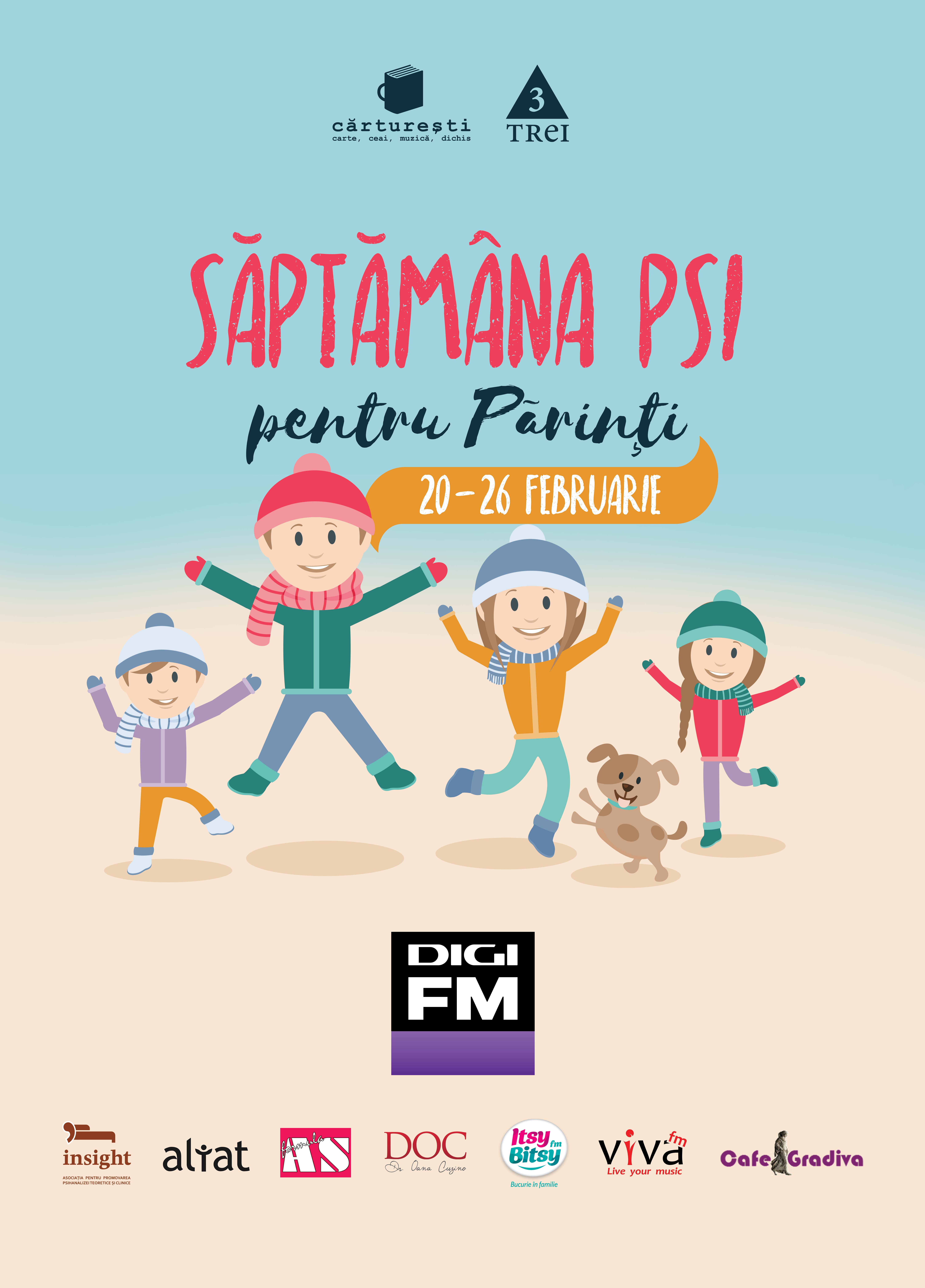 Atelierele ”psi” vor începe de la orele 18.30 și se vor desfășura în perioada 20-26 februarie 2017. Pe tot parcursul acestei săptămâni, cărțile editurii Trei dedicate parentajului și psihologiei copilului vor putea fi achiziționate cu o reduere de 25% în toată rețeaua Cărtureștilor. Intrarea este liberă