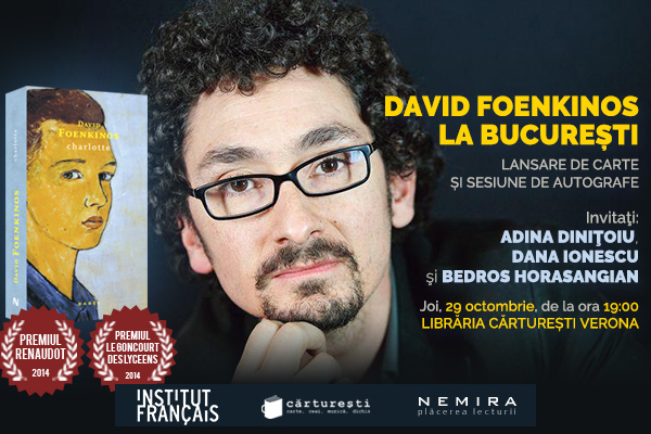 Joi, 29 octombrie, de la ora 19:00, la Librăria Cărtureşti Verona autorul se întâlneşte cu cititorii români pentru lansarea romanului Charlotte, câştigător al premiului Renadout şi care apare la editura Nemira, în colecţia Babel.