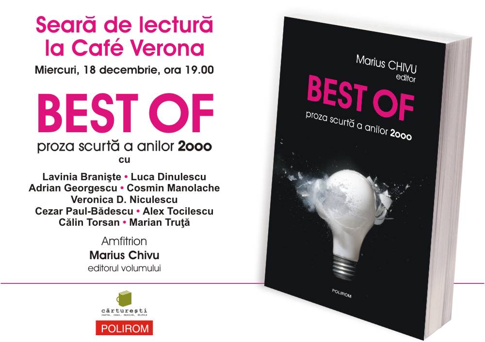 Miercuri, 18 decembrie, la ora 19.00, la Café Verona din Bucureşti, Editura Polirom vă invită la o seară de lectură, cu prilejul lansării antologiei Best of: proză scurtă a anilor 2000, o premieră în spaţiul editorial românesc.