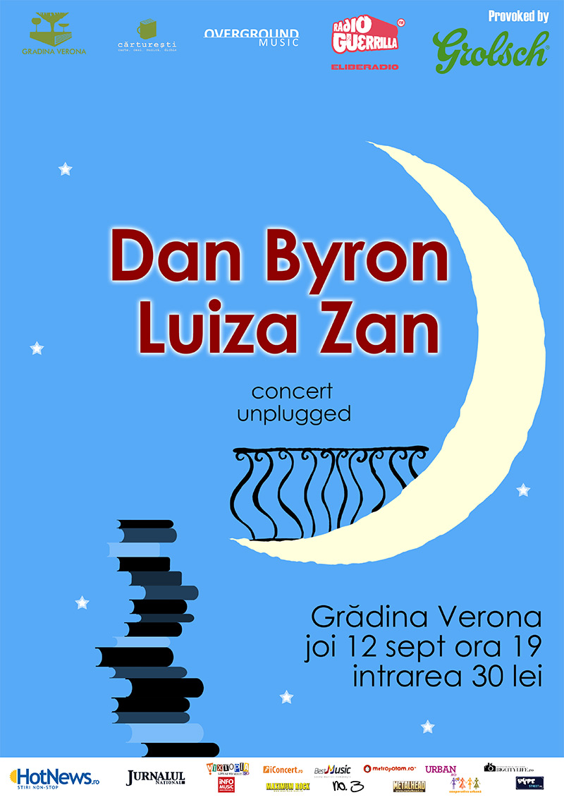 Joi, 12 septembrie, de la ora 19:00, la Gradina Verona din Bucuresti vor canta Luiza Zan si Dan Byron in formula Live Acoustic Duo. Avand la dispozitie doar vocile si chitarele, cei doi vor oferi un spectacol divers, ce-si trage seva din background-ul lor artistic extrem de variat. Rock, pop, jazz, gospel, toate isi au locul lor in interpretarea celor doi, facand din Live Acoustic Duo o experienta ce trebuie traita macar o data!