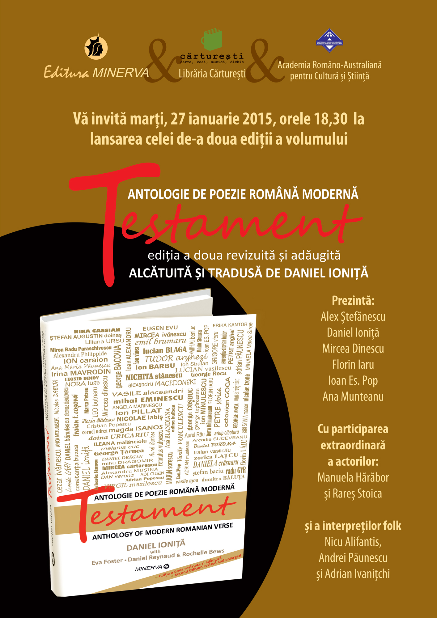 Editura Minerva, în colaborare cu Libraria Cărturești și Academia Româno-Australiană pentru Cultură și Știință, anunță ultima etapă a turneului de lansare a celei de a doua ediții, revizuite și adăugite a volumului TESTAMENT Antologie de poezie română modernă/ Anthology of modern romanian verse, în traducerea poetului australian de origine română, Daniel Ionița, în colaborare cu prof. Dr. Daniel Reynaud, Eva Foster și Rochelle Bews.