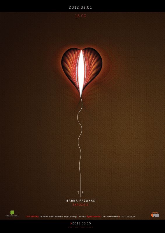 Joi, 1 martie 2012, începând cu ora 18 va avea loc la Cafe Verona vernisajul ‘’1.3’’ al artistului plastic Fazakas Barna. Expoziţia care va fi deschisă publicului larg până la 15 martie, cuprinde un rezumat artistic al graficianului Fazakas Barna originar din Miercurea Ciuc, dar care trăiește și creează în Leuven, Belgia ca freelancer grafician, artist plastic şi dj.