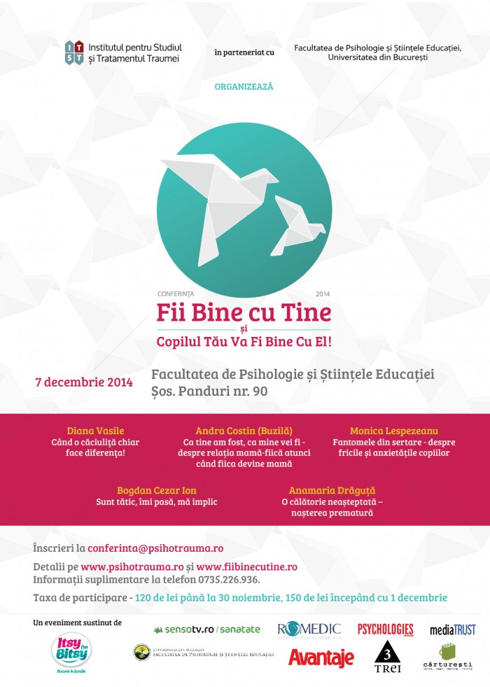 Institutul pentru Studiul și Tratamentul Traumei (I.S.T.T.) anunță organizarea conferinței Fii Bine cu Tine! în data de 7 decembrie 2014, la Facultatea de Psihologie și Științele Educației, Universitatea din București. Evenimentul, aflat deja la cea de-a II-a ediție, are anul acesta tema Fii Bine cu Tine și Copilul Tău va Fi Bine cu El!. Sunt invitați să participe părinți și cei care se pregătesc să devină părinți preocupați de prevenirea experiențelor traumatice, de creșterea capacităților de a se descurca cu situațiile provocatoare și de dorința de a aduce un plus de calitate vieții lor de familie.