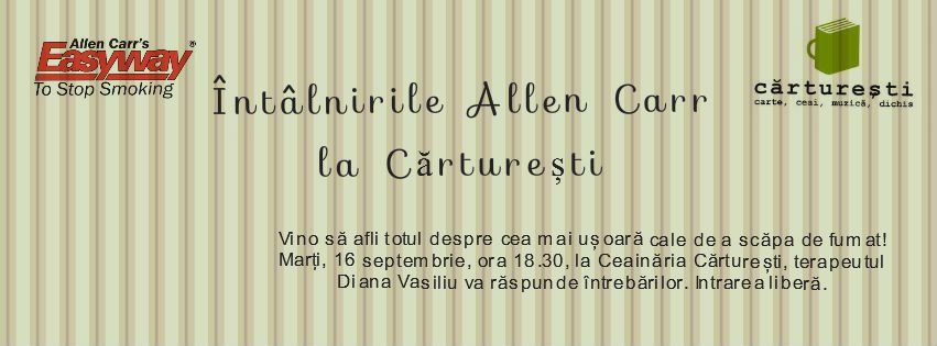 Marți, 16 septembrie, ora 18.30, deschidem seria Întâlnirilor Alen Carr la Cărturești, cu o primă prezentare a metodei și sesiunilor antifumat, pe care le oferim la Allen Carr Easyway Romania.