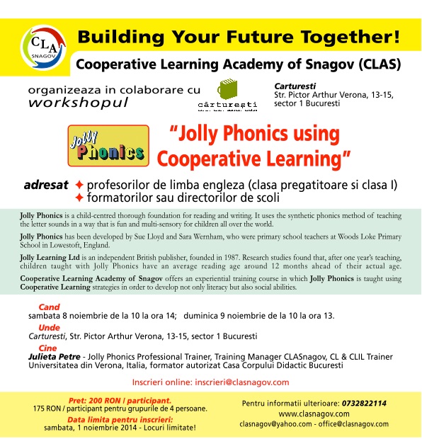 Cărturești și Cooperative Learning Academy of Snagov vaă invită să participați pe 8 și 9 noiembrie la seminarul intitulat “Jolly Phonics using Cooperative Learning”. O vom avea ca invitat pe doamna Julieta Petre, formator autorizat CCD și trainer Jolly Learning (pentru mai multe detalii: http://jollylearning.co.uk/jolly-training/petre-julieta-gratiana/). Dumneaei va prezenta tehnici de predare prin cooperare a citirii și scrierii în limba engleza, utilizând materialele Jolly Phonics și metodele caracteristice predării prin cooperare.
