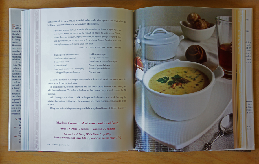 Cartea nu este însă doar un produs de marketing. Dacă Sariann şi Chelsea blufează, o fac cu mult talent. Am spune mai degrabă că tipele au scotocit temeinic prin cărţi de bucate medievale şi elisabetane, dar şi printre reţete datând din vremea în care Anglia se afla sub stăpânirea romanilor, punând la bătaie ingredientele şi tehnicile gastronomiei contemporane. Nu e nevoie să fii vreun mare chef ca să te bucuri de savoarea bucătăriei din Westeros, spun ele, doar că Heston Blumenthal le contrazice cu show-ul Heston’s Feast, care la noi se difuzează pe TV Paprika, în care găteşte cele mai sofisticate preparate (pe alocuri de-a dreptul scârboase pentru neiniţiaţi) pe care le ingurgitau nobilii englezi – deci nu e chiar floare la ureche. Dar cui îi pasă, doar nu ne vor cădea capetele în lupta cu nişte prepeliţe înecate în unt, o plăcintă cu porumbel, un păstrăv învelit în bacon, nişte piersici coapte cu miere sau o supă de sfeclă roşie… V-aţi prins, tocmai ce v-am enumerat câteva reţete din A Feast of Ice and Fire. Se poate cumpăra de la Cărtureşti, dacă v-am făcut curioşi.