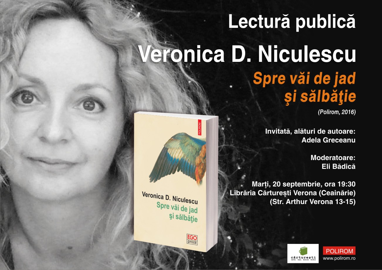 Editura Polirom vă invită marţi, 20 septembrie, de la ora 19:30, la Librăria Cărtureşti Verona – Ceainărie (str. Arthur Verona 13-15), la o întîlnire cu scriitoarea Veronica D. Niculescu, eveniment prilejuit de apariţia primului său roman, Spre văi de jad şi sălbăţie, la Editura Polirom, în colecţia „Ego. Proză”, disponibil şi în ediţie digitală.
