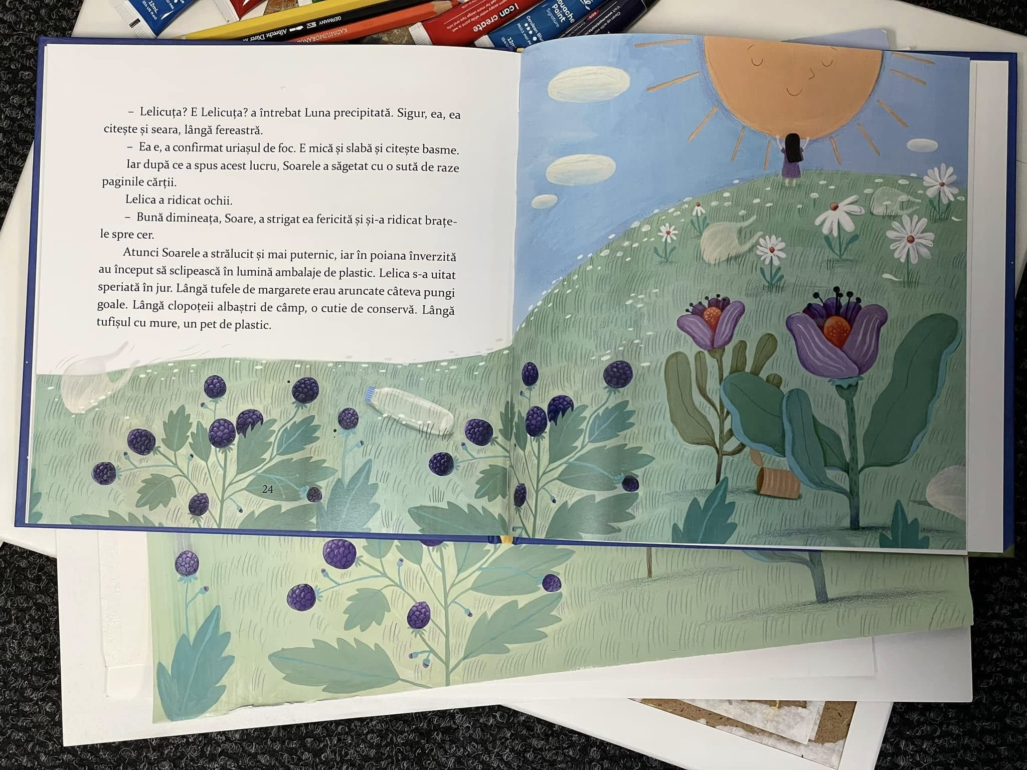 Sunt aceste două direcții pe care am vrut să le îmbin. Faptul că Lelica devine prietena Soarelui și a Lunii fiindcă citește povești. Spre deosebire de toți ceilalți care se ascund de soare și verifică condițiile meteo doar în aplicații, ea se uită la cer, se bucură de natură, dar e și o cititoare. Cumva am încercat să sugerez că ai nevoie de lectură, de sensibilitate, de atenție și dragoste față de viața din jur, ca să începi să înțelegi importanța mediului înconjurător. Și atunci când ea observă plasticul și deșeurile din jurul ei, se implică, face curățenie. Mai mult, devine un model. Iar Soarele și Luna o îndrăgesc. Ceea ce ar trebui să determine cititorul să vrea să devină un prieten al Soarelui, al planetelor, al corpurilor cerești. Și o poate face foarte simplu, devenind responsabil, dar și rămânând un cititor fidel. Pentru că e acest cod după care recunoaștem prietenii Soarelui: ei citesc și au grijă de planeta noastră.