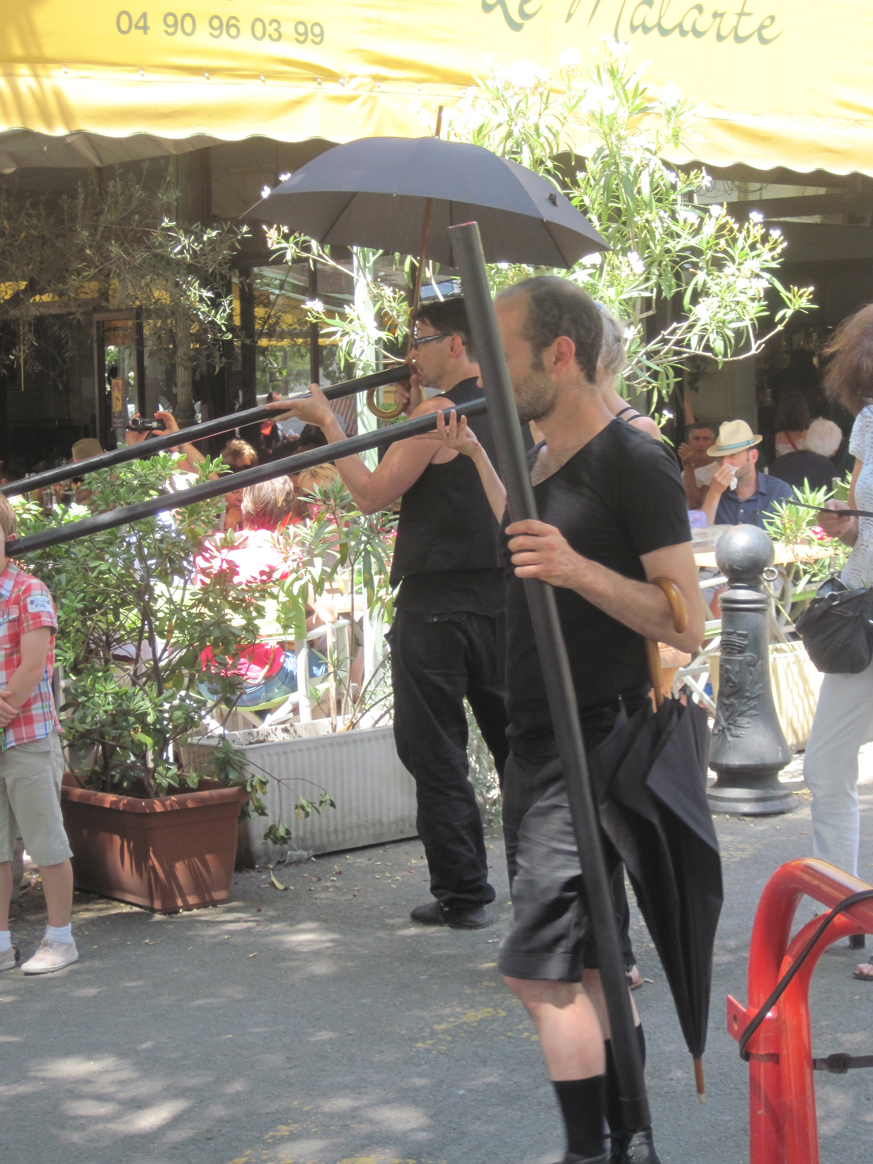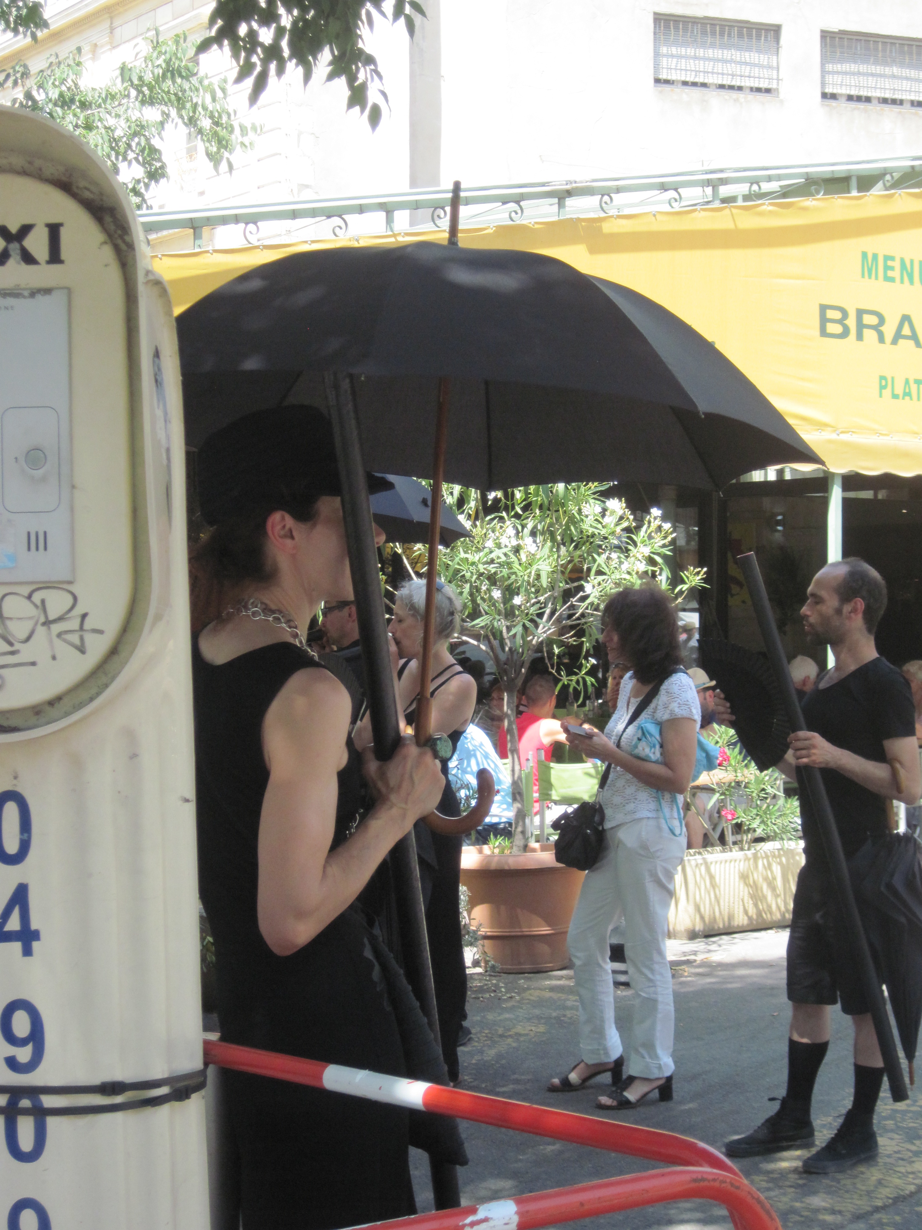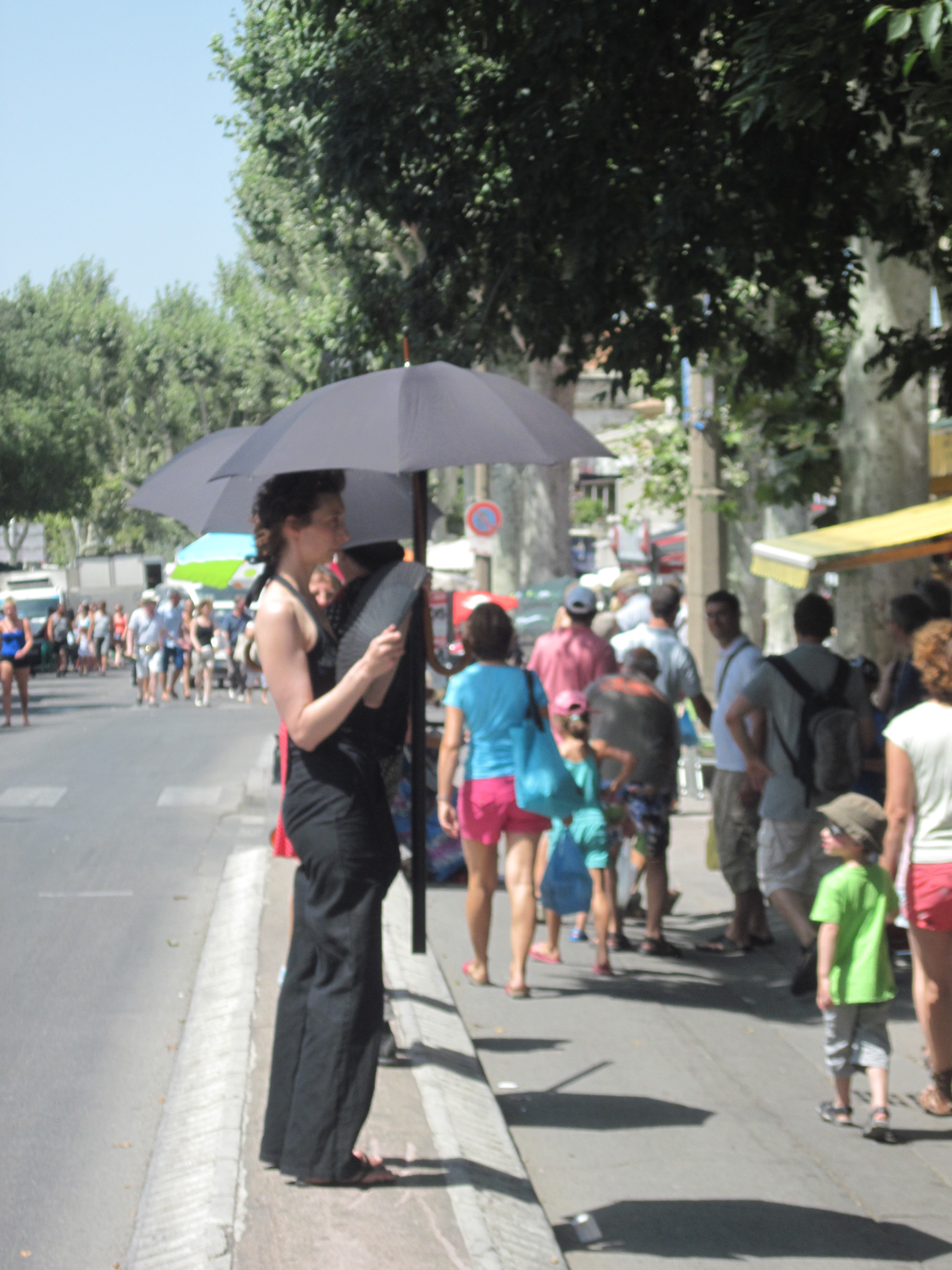 Pînă și eu, efemeră cum sînt, în aceste locuri, le mai pot spune azi o dată vînzătorilor au samedi prochain! Ca de obicei, merg pînă la capătul pieței, pînă la ultima tarabă. Apoi mă întorc pe celălalt trotuar, spre localul Malarte, trecînd cu greu printre oamenii care se uită neobosiți la săpunuri, genți, vase de ceramică, pălării de soare, plutind printre bulele de săpun răspîndite de o vînzătoare de jucării. Dau nas în nas cu o doamnă în negru. Ea ține în mînă o umbrelă neagră, își face vînt cu un evantai negru. Merg mai departe, altă doamnă în negru, apoi un domn în negru, alte umbrele negre, alte evantaie negre care vînează timid canicula din Arles. Încerc să-i fotografiez, o mînă întinde spre urechea mea un tub lung negru, la capătul lui e una dintre femeile în negru, ne cercetăm cu privirea pentru o clipă, apoi gura ei se fixează la capătul tubului și începe: Il y a que vivre et vivre… Și mai încolo un pic: elle avait pris l’habitude de pleurer pour toute sorte de petites choses. Se scurge în urechea mea un poem, mi-l șoptește ea și susurul fin e transportat de-a lungul tunelului negru pînă în auzul meu, într-o lipsă totală a gravitației. Aș putea spune că e un poem scris de mine, într-atît îmi seamănă. E despre frică, iubire, plîns, abandon, lucruri neînsemnate și mereu despre pofta de viață, care se ridică peste toate cele dintîi, ca baloanele de săpun acum peste Boulevard des Lices. La sfîrșit, cu gesturi foarte încete, îmi întinde un mic pliant negru, ei sunt cei de la Les Souffleurs Commandos Poétiques, care le șoptesc oamenilor poezii la ureche. Deschid pliantul și citesc: Les Souffleurs s’inscrivent dans l’évidence du clignotement général du monde. Usent de la nécessité vitale du droit d’irruption poétique et pratiquent l’art contre le divertissement, l’essentiel contre le stratégique et le jubilatoire contre le conventionnel.