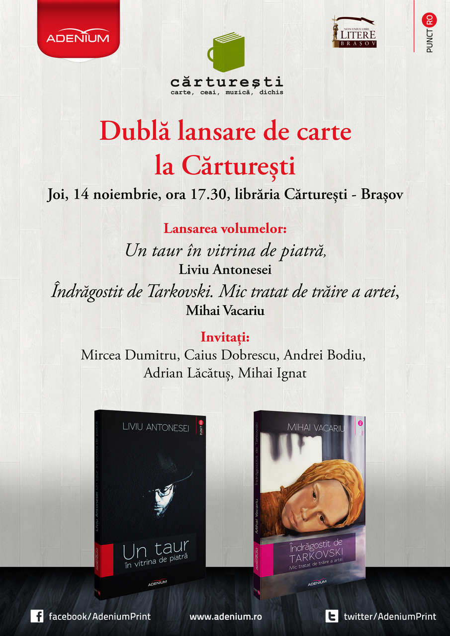 lansare liviu vacariu brasov.jpg2Librăria Cărtureşti din Braşov, gazda, împreună cu Editura Adenium din Iaşi şi Facultatea de Litere din Braşov, vă invită joi, 14 noiembrie, de la ora 17:30,  la o dublă lansare de carte: eseul Îndrăgostit de Tarkovski. Mic tratat de trăire a artei, de Mihai Vacariu şi volumul antologic de poezii Un taur în vitrina de piatră, de Liviu Antonesei, ambele apărute la Editura Adenium, în colecţia Punct RO. Eseu, respectiv Punct RO.Poezie.