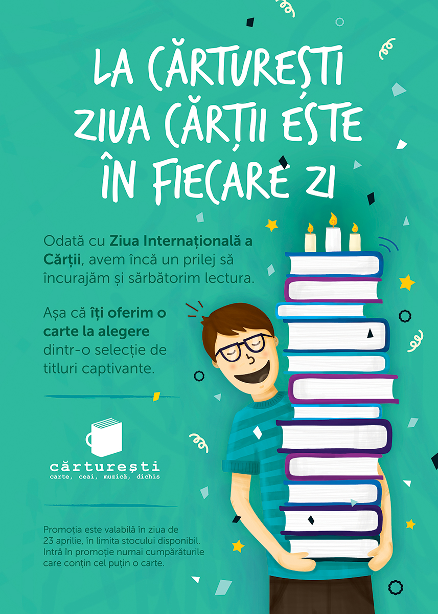 Și pentru că nu poate exista o sărbătoare a cărții fără să fie celebrați și cititorii ei, în data de 23 aprilie vă oferim la orice achiziție care conține cel puțin o carte, un volum la alegere dintr-o selecție de titluri captivante.